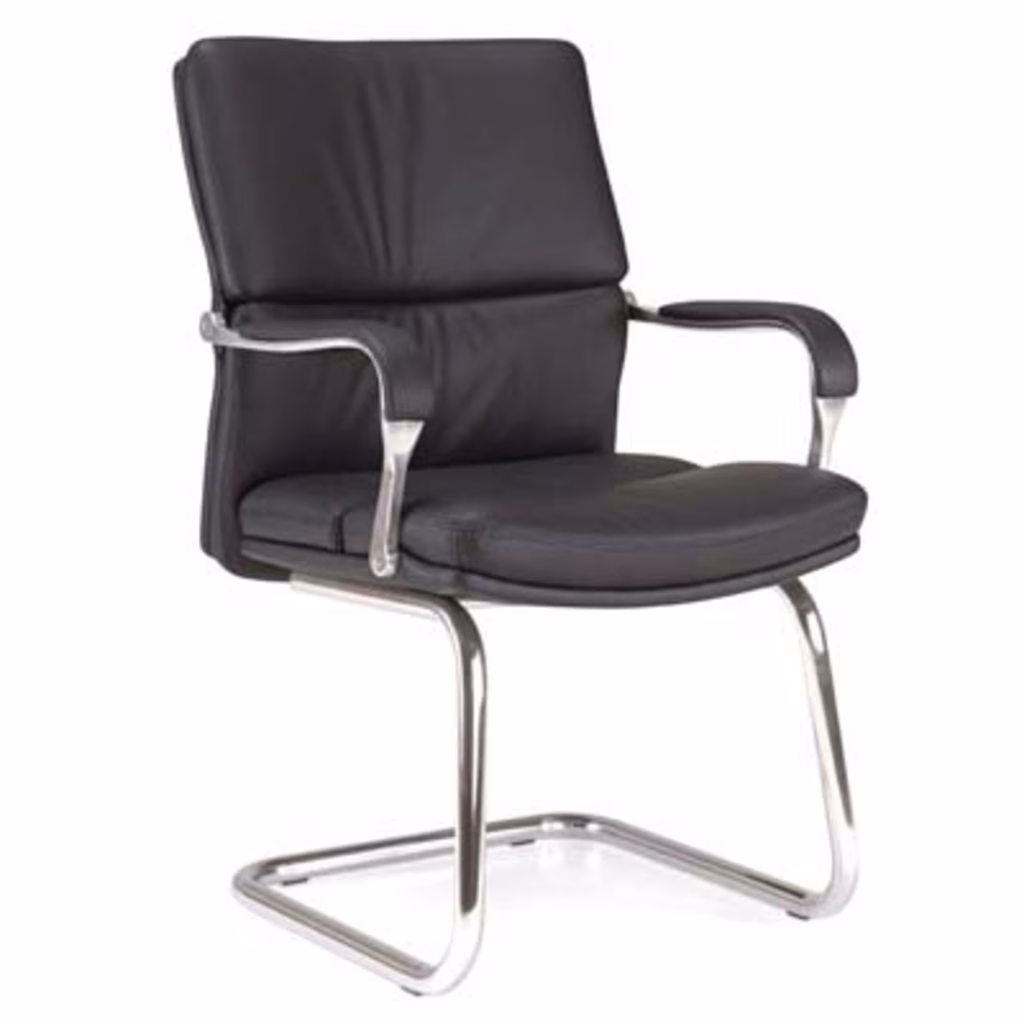 Poltrona direzionale classica monoscocca caratterizzata dal particolare bracciolo in alluminio con pad imbottito e rivestito - Struttura in multistrato di faggio - Versione visitatore con schienale medio proposta su base a slitta con tubolare d'acciaio cromato - Rivestimento Ecopelle - Garanzia 5 anni