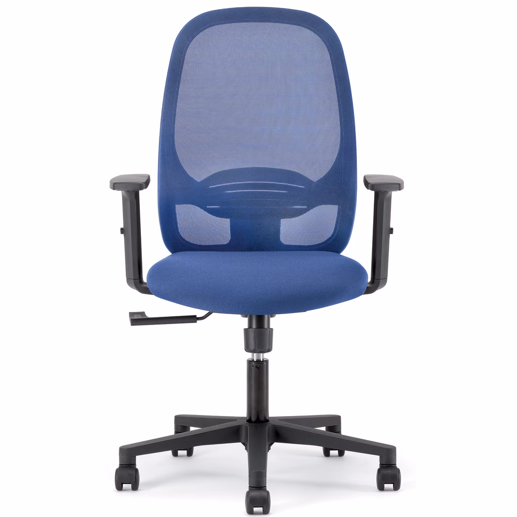 Schienale in rete ignifuga di colore blu - colore sedile: blu - Interno sedile in multistrato di legno, sotto sedile in polipropilene - Imbottitura sedile in poliuretano espanso ignifugo ad alta densità rivestito in tessuto ignifugo Teddy(test usura 85.000 cicli Martindale) - Supporto lombare regolabile inaltezza integrato nello schienale - Meccanismo synchron bloccabile in più posizioni con regolazione dell'intensità dell'oscillazione in funzione del peso dell'utilizzatore - Dispositivo antishock - Braccioli regolabili in altezza - Base a 5 razze in nylon nero su ruote pivotanti gommate frenate - Conforme alle norme UNI-EN 1335 in classe "B"