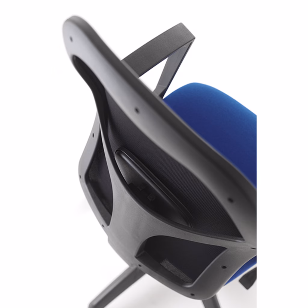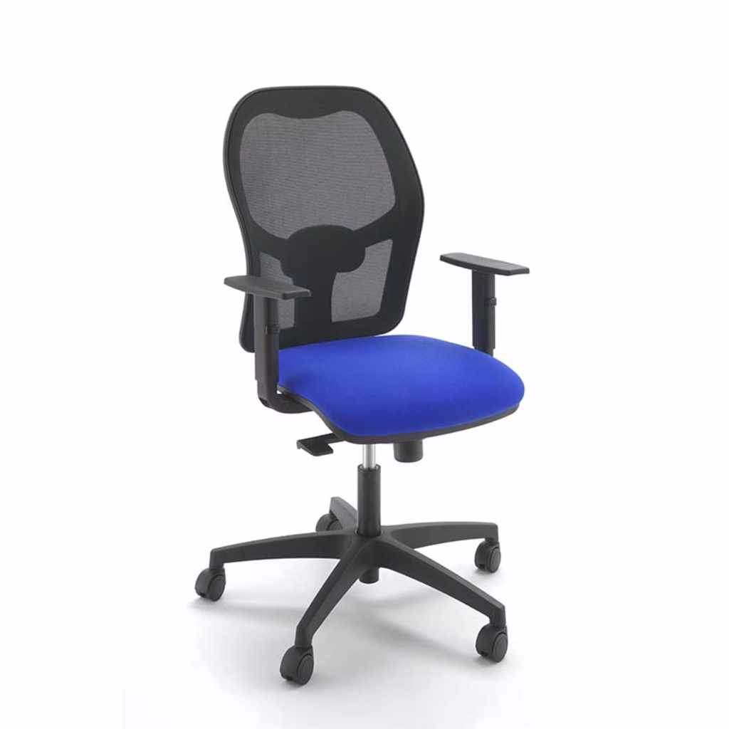 Schienale in rete di colore nero con supporto lombare integrato regolabile in altezza - colore sedile: blu - Interno sedile in multistrato di legno - Imbottitura sedile rivestita con tessuto ignifugo Bond (testusura 100.000 cicli Martindale) - Meccanismo synchron multiblocco con dispositivo di sicurezza antishock e con regolazione resistenza all'oscillazione tramite pomolo posto sotto la seduta, per adattare l'utilizzo ad ogni operatore - Base a 5 razze diametro 66 cm in nylon nera su ruote pivotanti - Braccioli regolabili in altezza - Certificata UNI EN1335"B" - Garanzia 5 anni