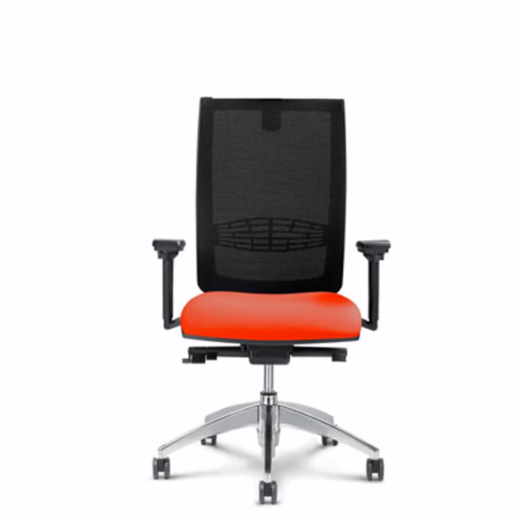 Schienale in rete colore nero - Meccanismo syncron autopesante multiblocco - Portata 150 kg - Poggiatesta opzionale - Regolazione in profondità del sedile - Supporto lombare regolabile in altezza integrato nello schienale - Base a 5 razze in alluminio - Ruote gommate autofrenanti - Braccioli regolabili 3D (altezza, profondità ed orientamento) - Versione con sedile in tessuto ignifugo Mirage - Certificata UNI EN 1335 in classe "B" - Certificata CAM - Garanzia 5 Anni