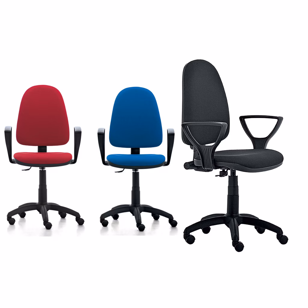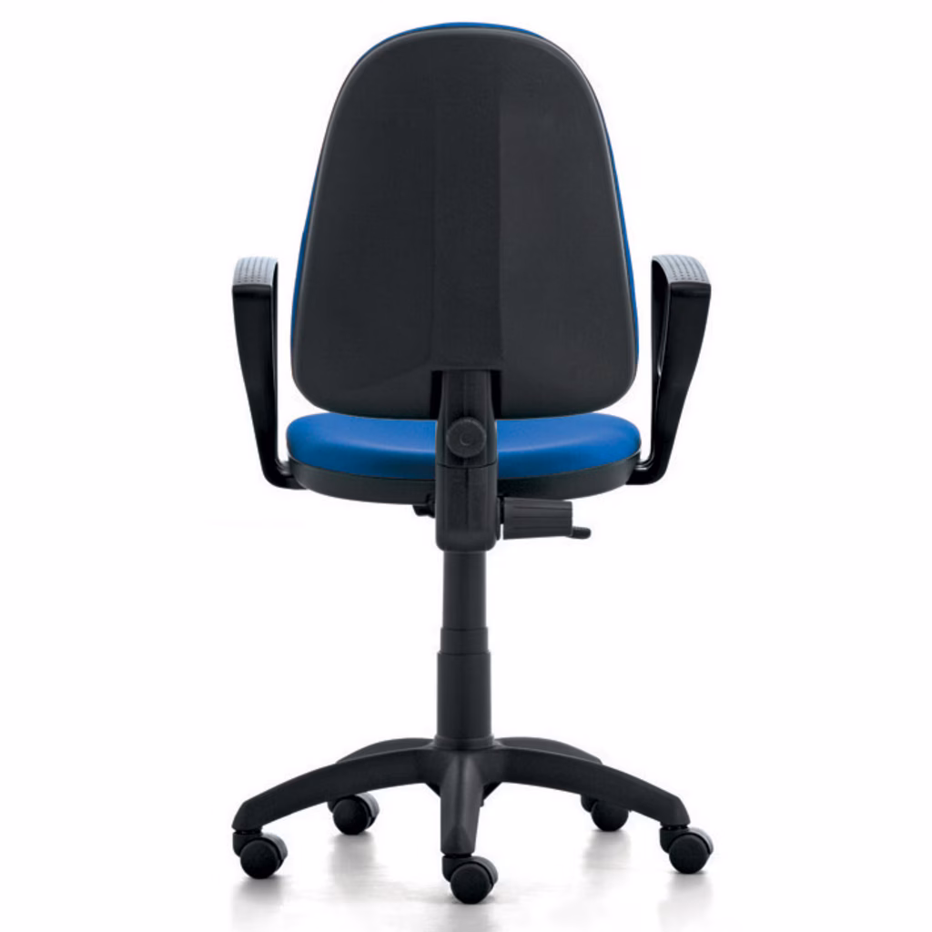 Sedia dattilo con interno sedile in multistrato di legno - Imbottitura in poliuretano espanso ignifugo rivestito con tessuto ignifugo - Regolazione in altezza dello schienale tramite volantino - Braccioli fissi in polipropilene - Meccanismo a contatto permanente - Base a 5 razze in nylon nera su ruote pivotanti - Certificata EN1335" B" ed Omologata in classe 1IM - Garanzia 2 anni