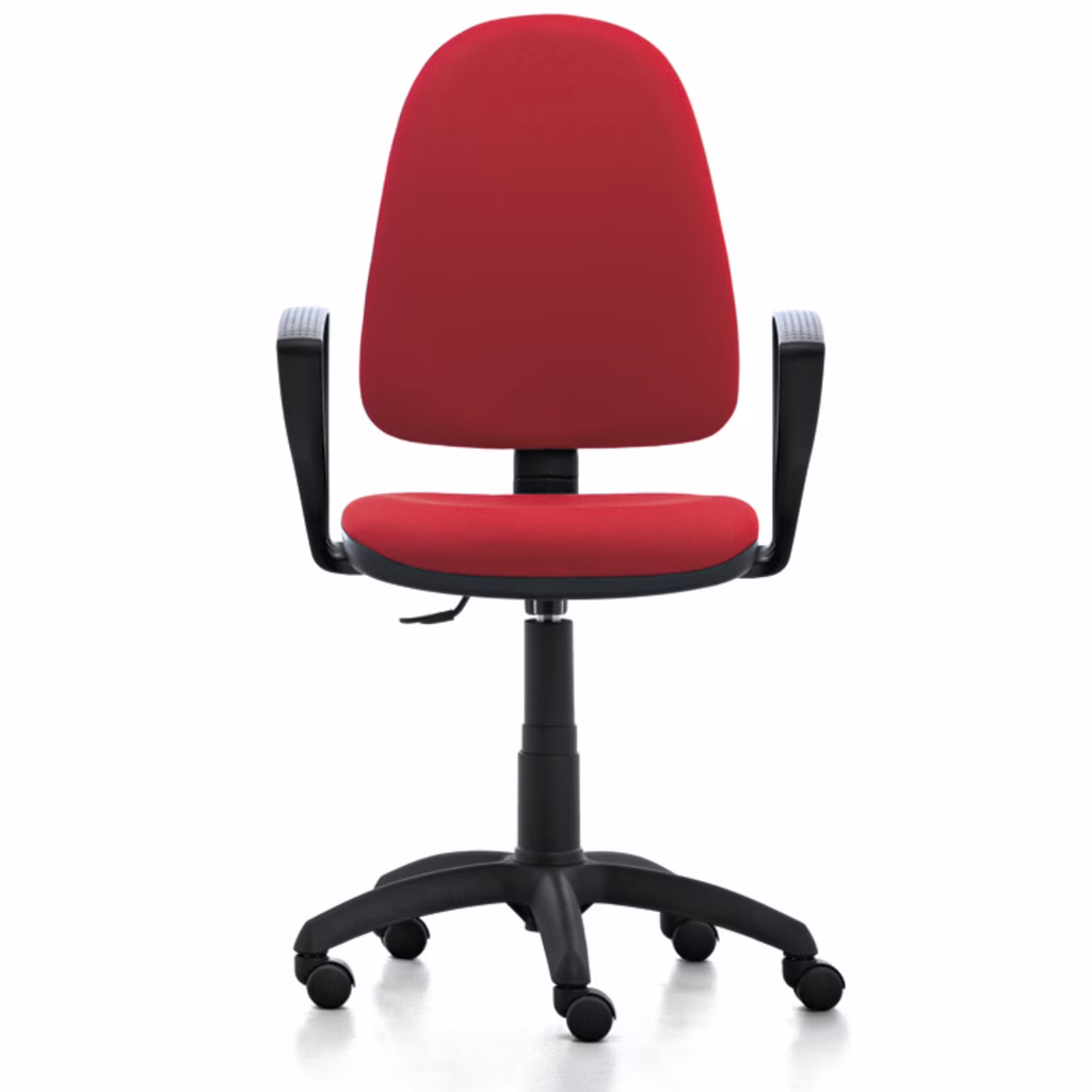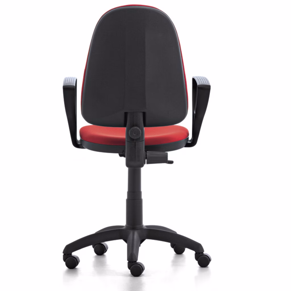 Sedia dattilo con interno sedile in multistrato di legno - Imbottitura in poliuretano espanso ignifugo rivestito con tessuto ignifugo - Regolazione in altezza dello schienale tramite volantino - Braccioli fissi in polipropilene - Meccanismo a contatto permanente - Base a 5 razze in nylon nera su ruote pivotanti - Certificata EN1335" B" ed Omologata in classe 1IM - Garanzia 2 anni