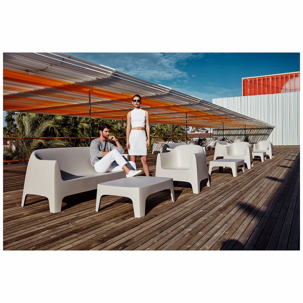 Si tratta di un gruppo di oggetti che, pur essendo leggeri, offrono stabilità grazie al loro taglio geometrico e ben definito, come se fossero scolpiti nella pietra. La collezione comprende un divano, una poltrona, una sedia senza braccioli, una sedia con braccioli, un tavolo e un tavolino. È una collezione funzionale grazie alla sua pieghevolezza e al design. Realizzati in polipropilene per iniezione con carica minerale. Impilabili. Proposti nei colori bianco e tortora. Adatti per interni ed esterni.