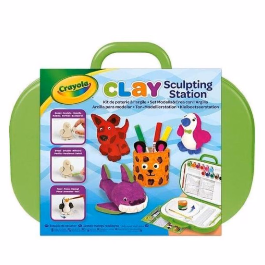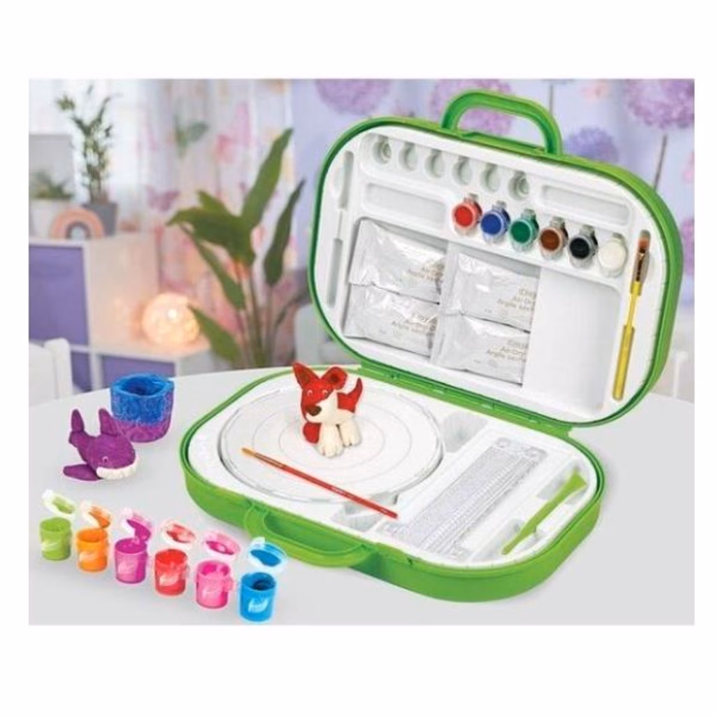 Contiene: 4 bustine di argilla, 2 strisce da 6 barattolini da tempera lavabile, 2 pennelli, 2 fogli con motivi decorativi, strumento per modellare, valigetta richiudibile e guida di ispirazione.