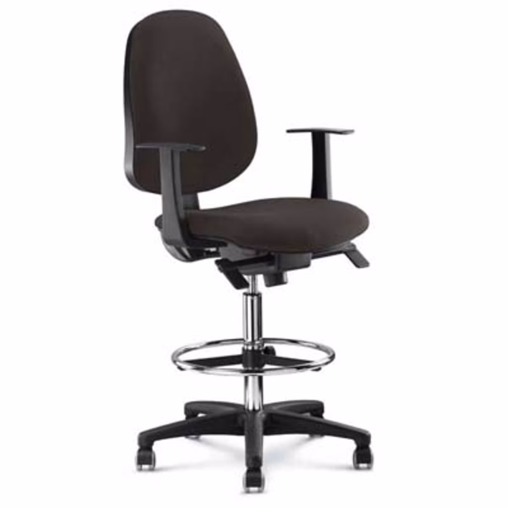 Schienale regolabile in altezza - Movimento regolato da meccanismo a contatto permanente evoluto multiblocco con regolazione della resistenza dell'inclinazione dello schienale in funzione del peso dell'utilizzatore - Poggiapiedi circolare cromato - Base a 5 razze in nylon nero su ruote gommate autofrenanti (a richiesta su piedini) - Omologazione in classe 1IM - Rivestimento tessuto - Garanzia 5 anni