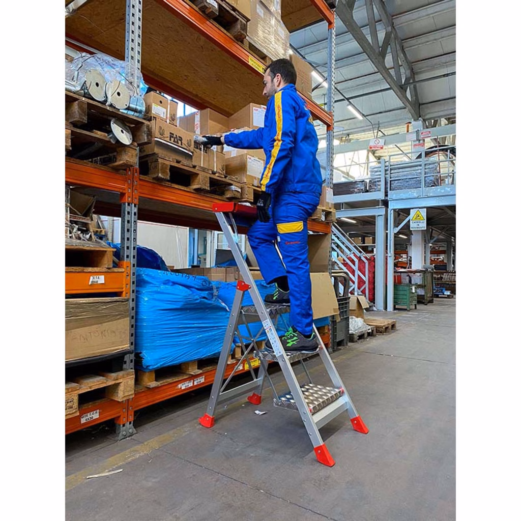 Sgabello professionale in alluminio anodizzato argento e gradini in acciaio inox - piano in acciaio INOX - lo sgabello chiuso occupa poco spazio ed è dotato di una pratica vaschetta porta oggetti - rispetta la normativa EN 131-1.2 e EN 14183
