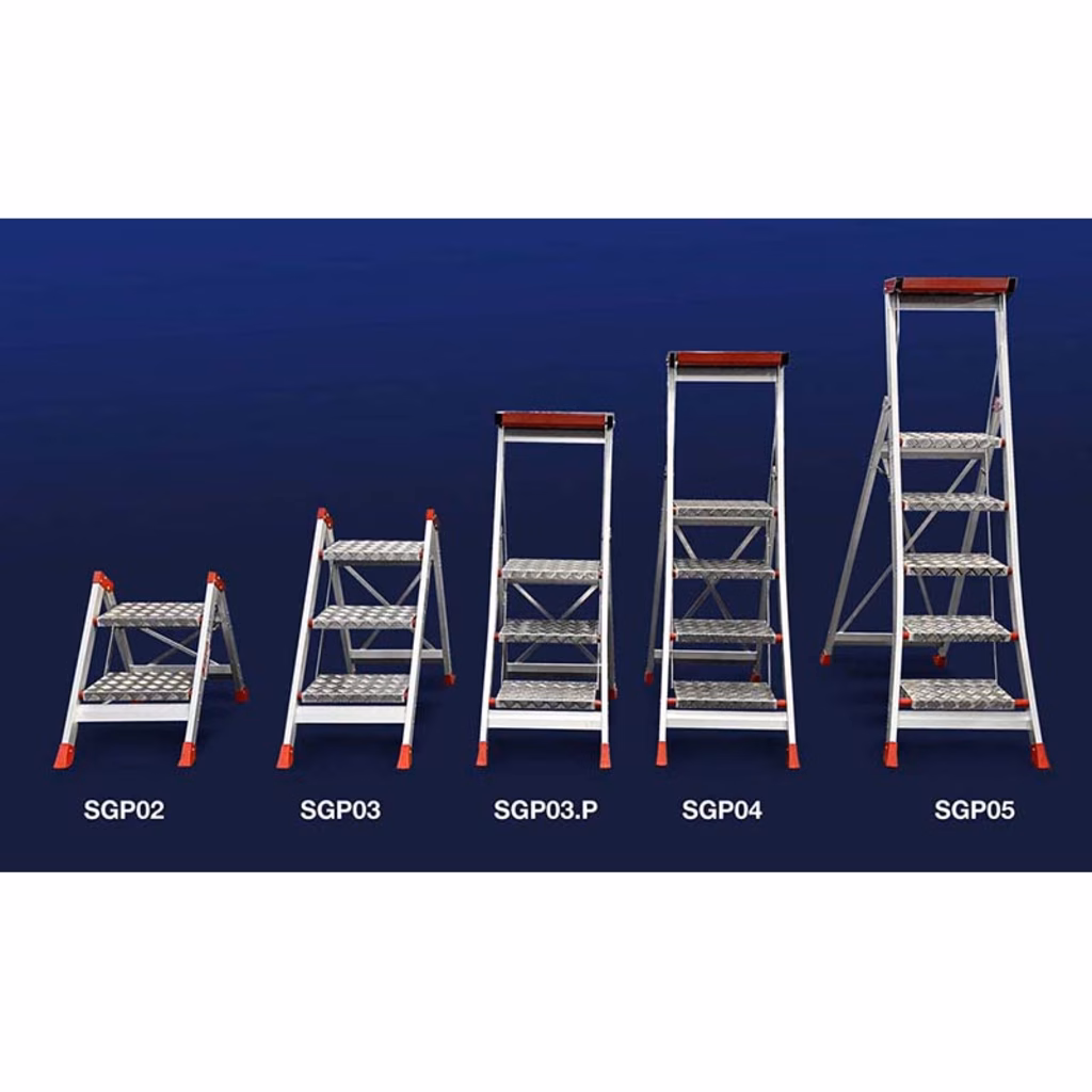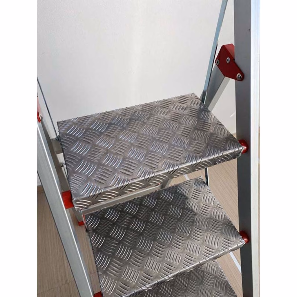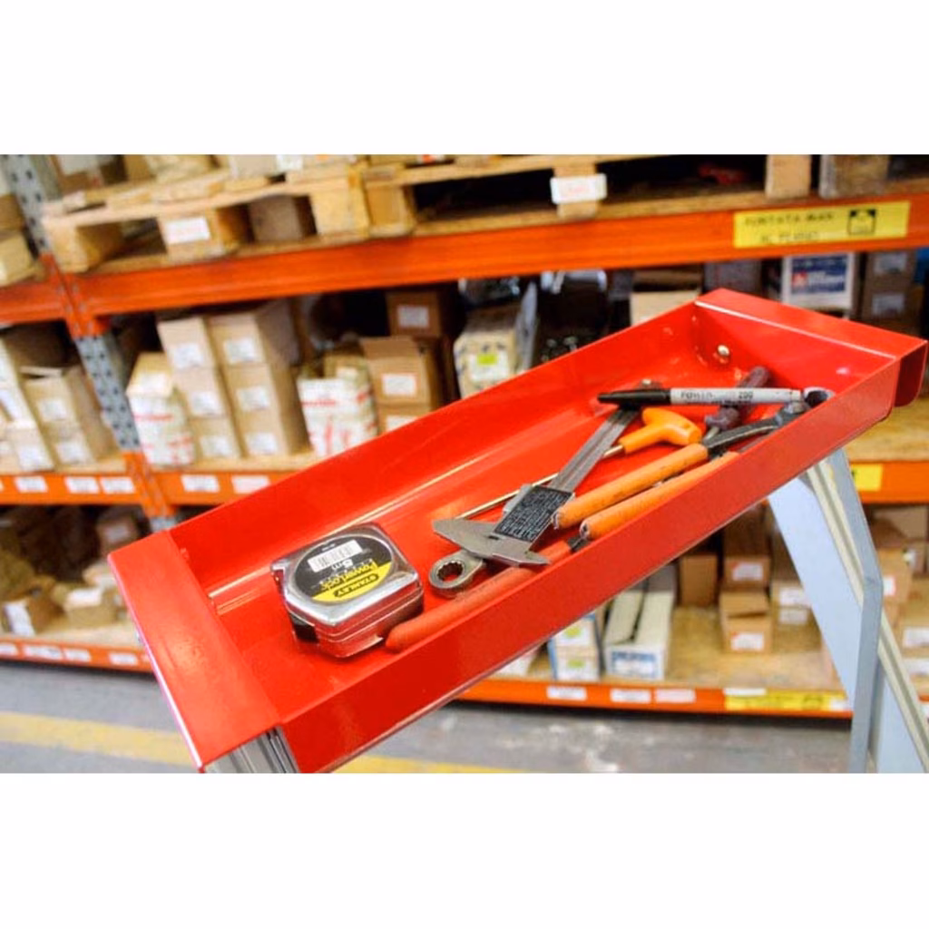 Sgabello professionale in alluminio anodizzato argento e gradini in acciaio inox - piano in acciaio INOX - lo sgabello chiuso occupa poco spazio ed è dotato di una pratica vaschetta porta oggetti - rispetta la normativa EN 131-1.2 e EN 14183