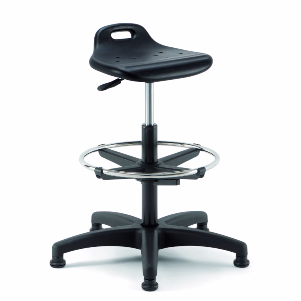 Seduta sgabello con sedile in poliuretano integrale - Sedile regolabile in altezza tramiteelevazione a gas - Anello poggiapiedi cromato regolabile - Base in nylon nero con piedini fissi