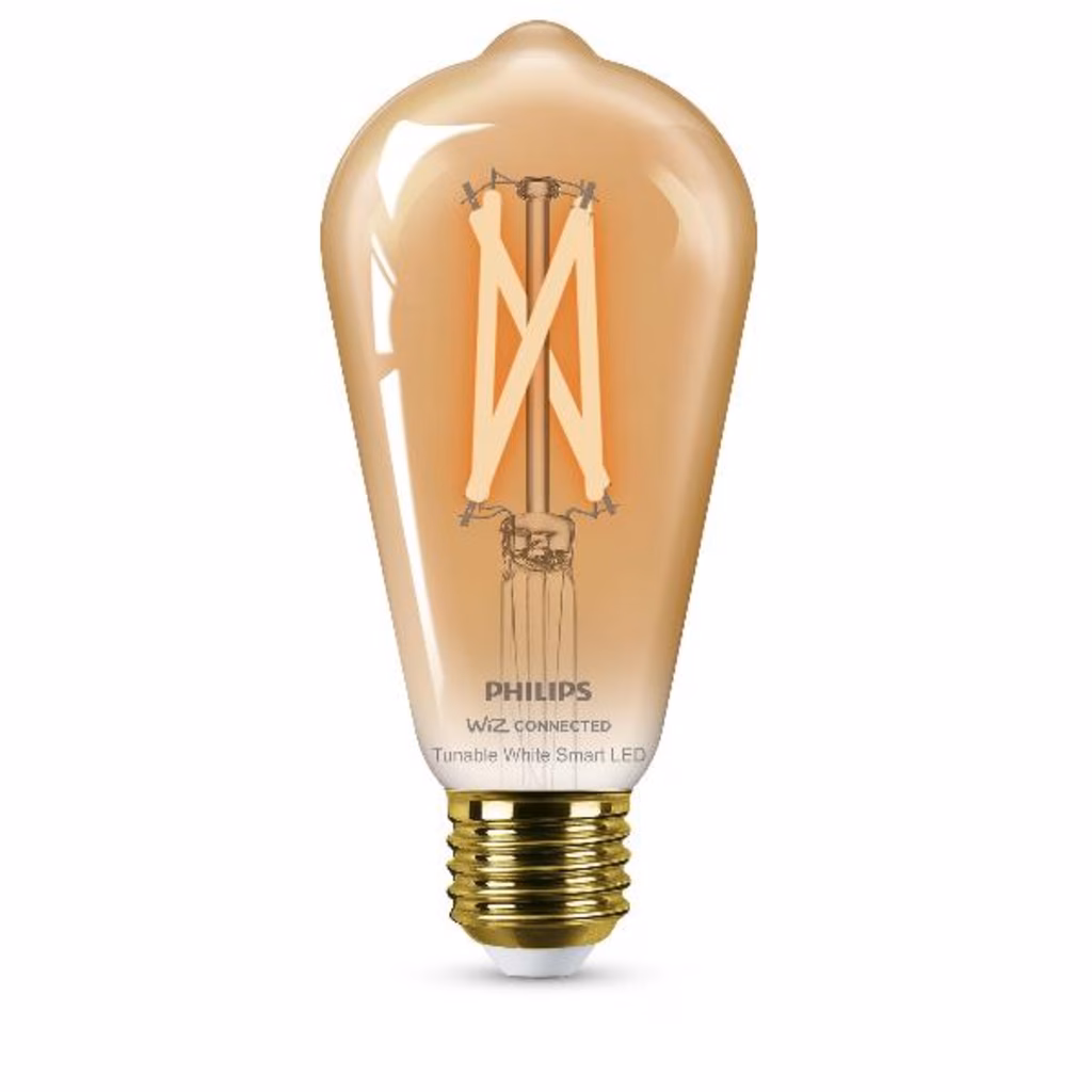 La forma stile Edison, la luce bianca da calda a fredda e il rivestimento ambrato di questa lampadina LED Philips smart a filamento conferiscono un tocco vintage a qualunque stanza. È una lampadina WiZ Connected. Usa il Wi-Fi esistente per controllarla con l'app WiZ o con la tua voce.