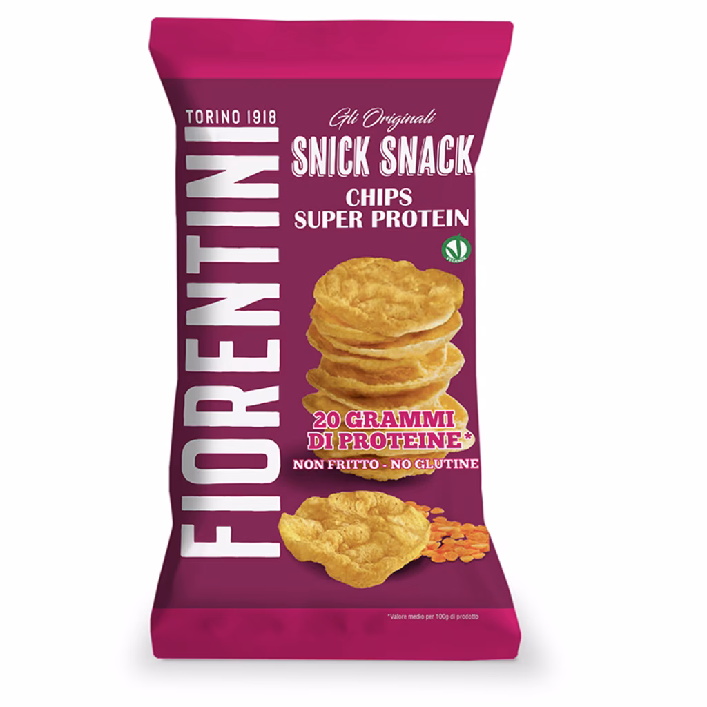 CHIPS DI LENTICCHIE ROSSE Le CHIPS SUPER PROTEIN Fiorentini, grazie ad un alto contenuto di proteine, ben 20 grammi su 100 grammi di prodotto, sono lo snack ideale per chi pratica attività fisica. A base di lenticchie rosse, sono croccanti e ricche di molteplici proprietà nutritive. Buona fonte energetica e ad alto contenuto di fibre, hanno un basso contenuto di grassi saturi: 100 grammi di prodotto apportano 353 kcal e contengono 14 grammi di fibre, ma soltanto 0,5 grammi di grassi saturi. Inoltre, sono senza glutine e certificate VeganOk, quindi perfette per ogni tipo di alimentazione, come spuntino prima o dopo l'attività sportiva.