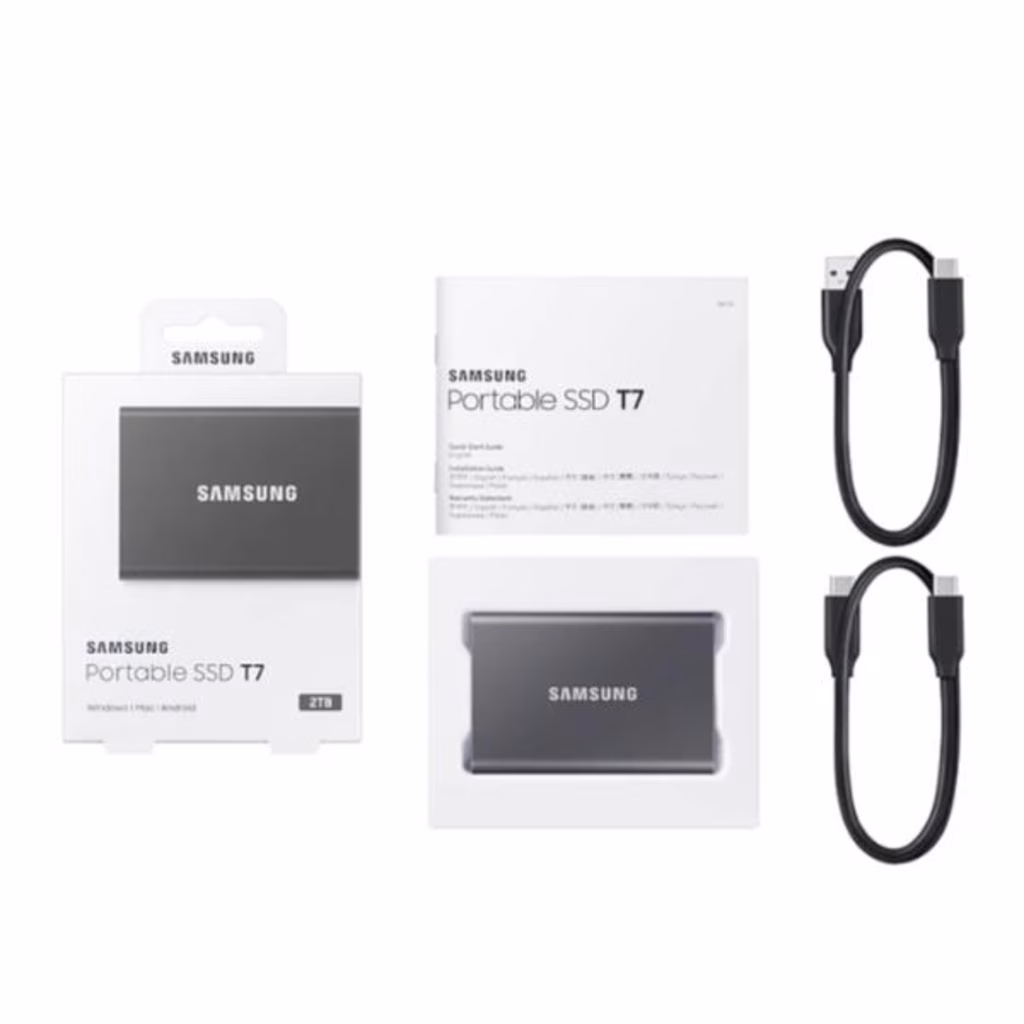 SSD Portatile T7 da 2000GB, uscita USB 3.2, velocità di lettura e scrittura sequenziali rispettivamente fino a 1,050MB/sec e 1,000 MB/sec, Crittografia AES256bit, Password per proteggere i tuoi dati. Peso circa 58g. Dimensioni (LxAxP) 85 x 57 x 8.0 mm