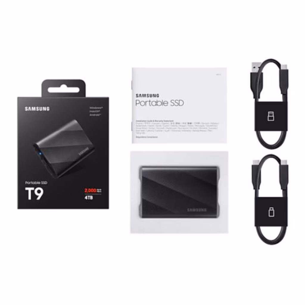 T9 è compatibile con tutti i tuoi dispositivi: dagli smartphone e tablet Windows®, macOS® e Android , alle console per gaming fino alle fotocamere 12K, e molto altro ancora. Nella confezione sono inclusi i cavi USB-C® a C e USB-C® ad A per una maggiore connettività.