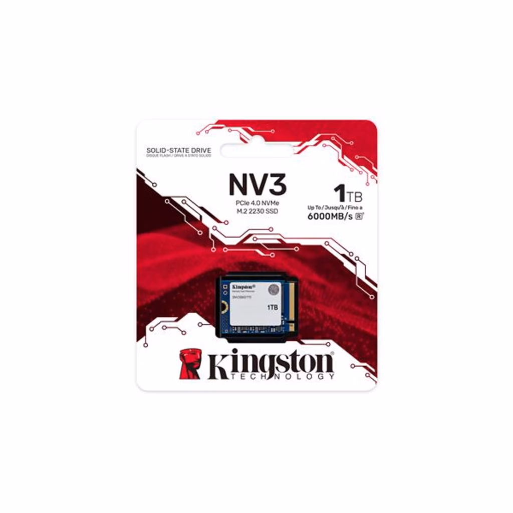 Kingston Technology 1000G NV3 M.2 2230 NVMe SSDPer esigenze di storage ad alta velocità e basso consumo I drive SSD NV3 PCIe 4.0 NVMe sono uno storage innovativo dotato di controller NVMe Gen 4x4 per raggiungere velocità in lettura/scrittura di 6.000/5.000MB/s*. Disponibili in entrambi i formati single-sided M.2 22x80 mm e 22x30 mm, espandono lo storage in sistemi compatti come laptop e console portatili*****. Possono ridurre il consumo energetico e la produzione di calore, ottimizzando così le prestazioni del sistema senza comprometterne il valore, e offrono tutta la capacità di storage che serve ad applicazioni, documenti, foto, video, gaming e altri contenuti con capacità da 500GB a 4TB**. Prestazioni di livello Gen 4x4 NVMe PCIe Upgrade del sistema con velocità in lettura/scrittura fino a 6.000/5.000MB/s*. Piccola taglia, grande resa NV3 2280 e 2230 si integrano facilmente in laptop sottili e PC ultra piccoli con connettori M.2 e spazio limitato. Espansione dello spazio di storage Disponibile con ampie capacità che arrivano fino a 4 TB**, offre uno spazio di storage pressocché infinito, adatto a file, video, documenti e giochi. Più spazio, più giochi Con NV3 2230 è possibile aggiornare i sistemi di gaming portatili compatibili per tuffarsi nel gioco più rapidamente*****.