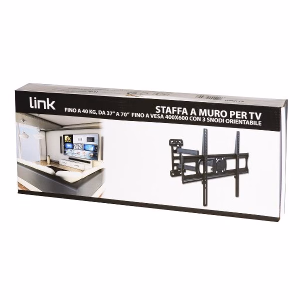 SUPPORTOA MURO PER TV LED, LCD, PIATTE DA 37 A 70"                                                                          Questo supporto permette l'orientamento ottimale della TV. La distanza dal muro è regolabile da 77 a 320 mm. grazie al braccio estensibile. La base di installazione è molto solida, la TV rimane fissa e stabile.      Per migliorare la visione permette l'orientamento del video sia in senso orizzontale laterale, di 45°, sia in senso verticale, alto/basso, 5/10°.                                                                                                          E' quindi semplice posizionare il video esattamente dove si desidera per in angolo di visione ottimale, e anche cambiare la posizione della TV a seconda della vostra posizione.                                                  Design aperto, che massimizza il flusso di aria per areare il video e fornire un comodo accesso al retro della TV. Supporta fino a 50 kg. In acciaio, è estremamente durevole e resistente.                                    Per standard VESA: 75x75, 100x100, 200x200, 400x200, 300x300, 400x400, 400x300, 400x600.                Con sistema di bloccaggio a sgancio rapido per la rimozione della TV. Viti e tasselli inclusi. Installazione semplice, si può installare sia su legno sia sui muri. Le istruzioni sono semplici e facili da seguire.