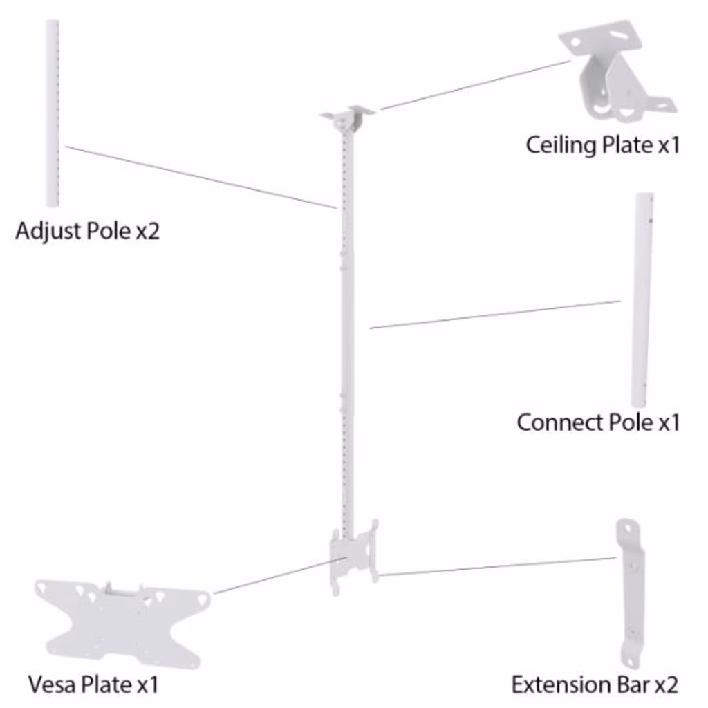 Supporto a soffitto per TV e monitor fino a 32", VESA max 200×200, telescopico da 55 a 150 cm, colore silver/bianco.