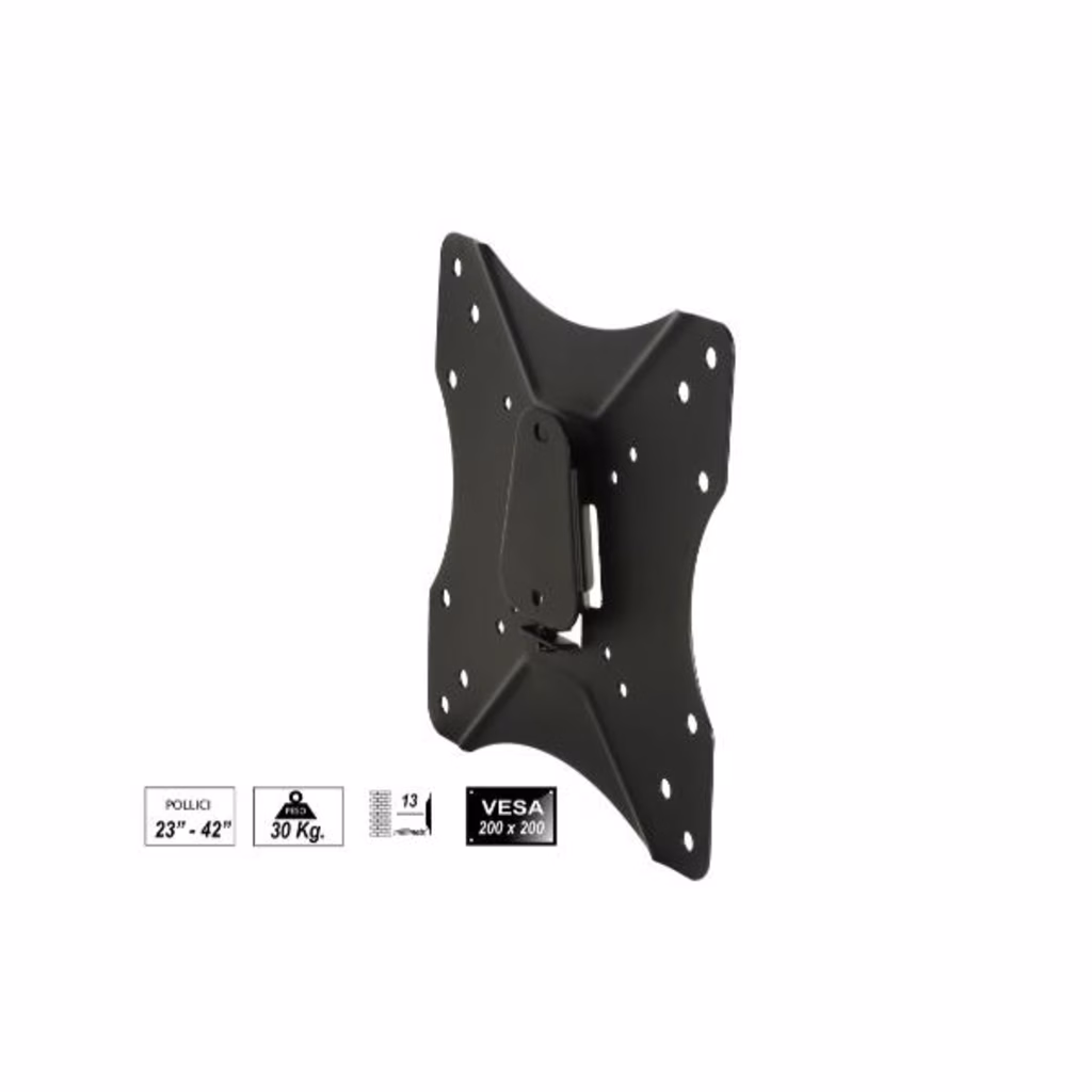 Staffa a muro in acciaio per montaggio a muro di TV/monitor/video LED e LCD piatti e ultra piatti. Dimensioni: 230x 230x13 mm.  Per schermi 23 - 42" fino a 25 kg, compatibile con standard VESA 75x75, 100x100, 200x100 e 200x200. Molto sottile, sporge dal muro solo 13 mm, supporto in due pezzi, semplice da montare.