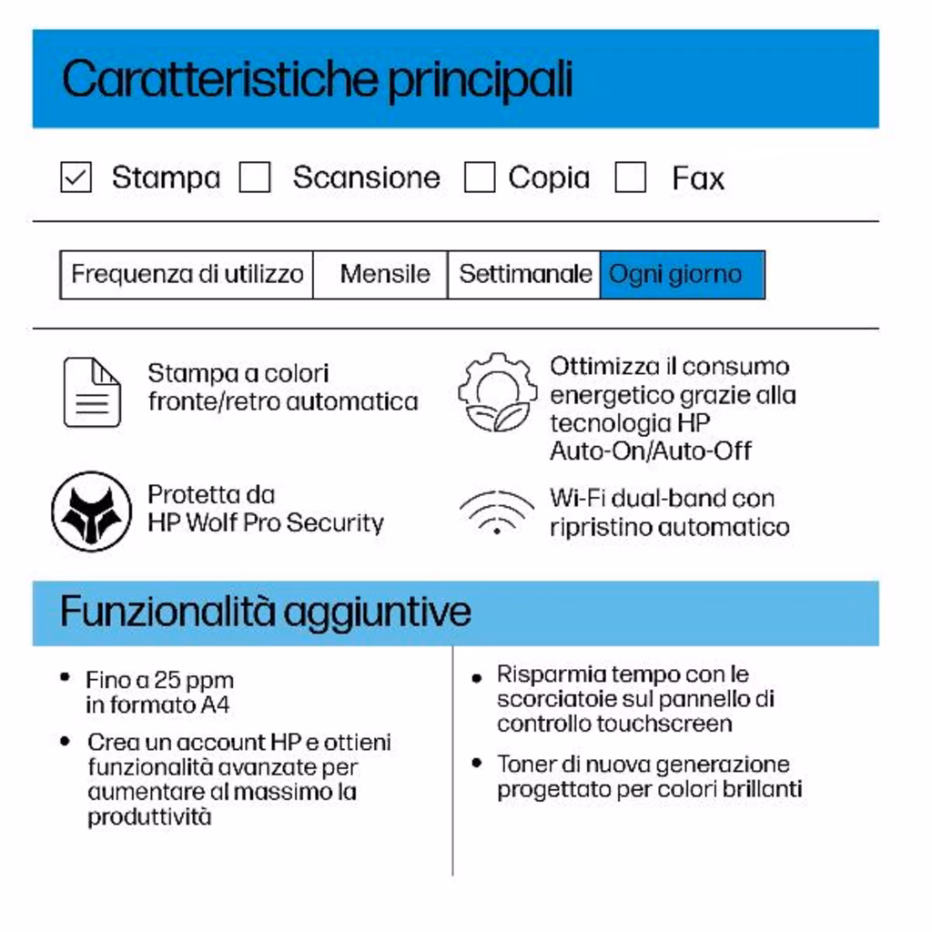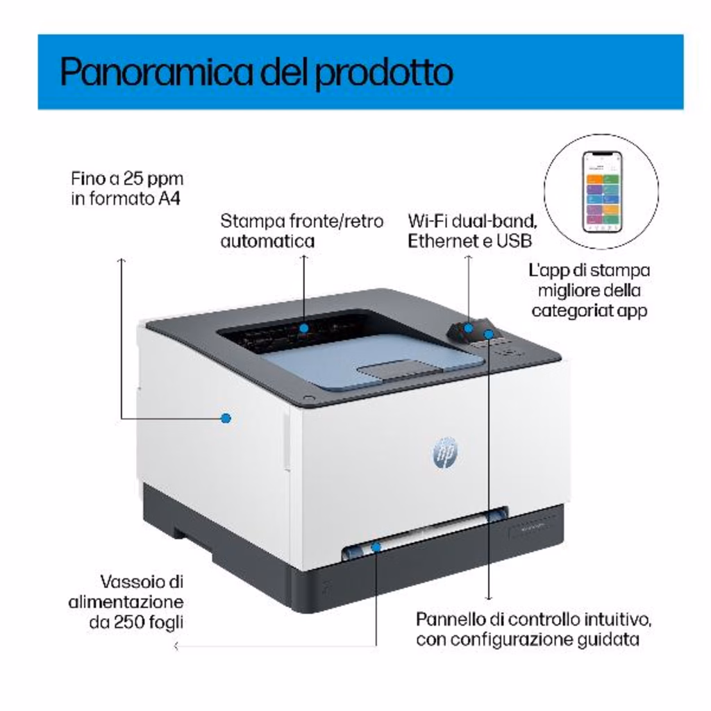 Stampa fronte/retro automatica e a colori, fino a 25 pagine al minuto. Con le cartucce toner HP TerraJet di ultima generazione ottenete colori brillanti e realistici per le stampe dell'azienda. Ottimizzate lo spazio di lavoro e aumentate l'efficienza del vostro team con questa stampante laser compatta.