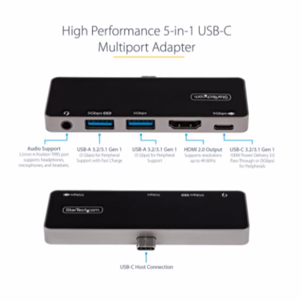 • FUNZIONALITÀ 5 IN 1: supporto video HDMI 2.0 (HDR) fino a 4K 60Hz tramite porta USB 3.1/3.2 Gen 1; hub USB-A a 2 porte (di cui 1 BC 1.2 per la ricarica rapida), un connettore audio TRRS per cuffie/microfono e 1 porta USB-C (dati + Power Delivery 3.0)