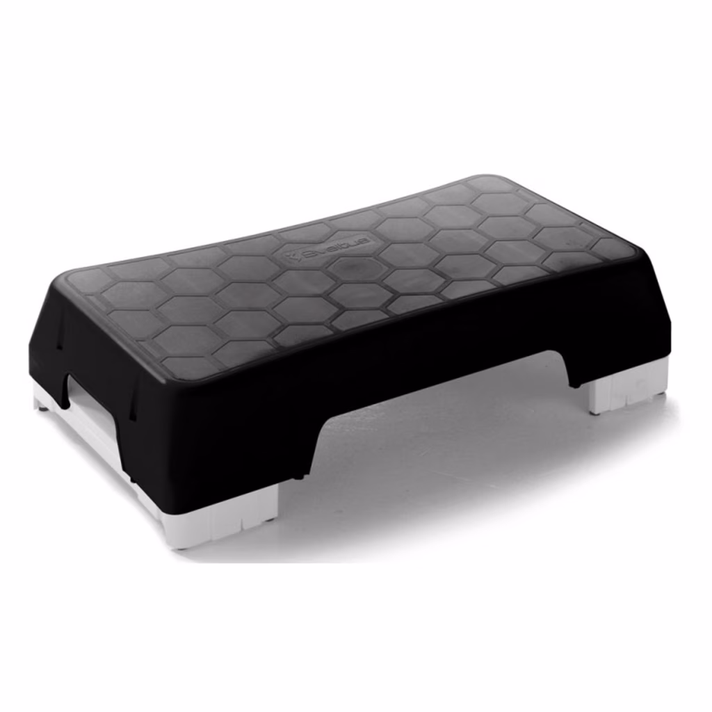 Step nero in polipropilene con piedini regolabili integrati sotto il gradino - Leggero e compatto è facilmente impilabile e pratico da spostare per gli allenamenti di group training. La superficie ha un rileivo antiscivolo in modo da rendere sicuro lo svolgimento dell'attività.