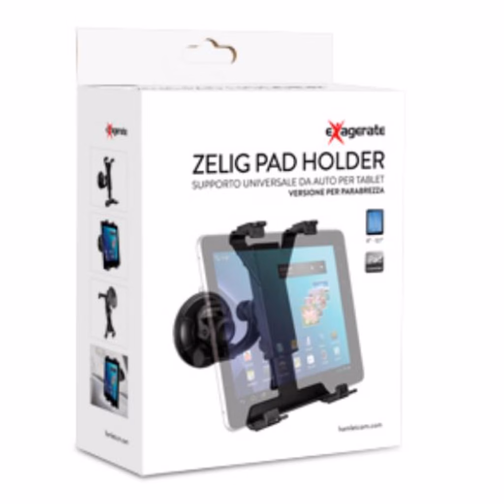 Exagerate Zelig Pad Holder è un supporto per Tablet PC di facile montaggio per il parabrezza anteriore dell'auto o per altre superfici piane/lisce. La potente ventosa e il supporto snodabile permettono un'installazione veloce e sicura del dispositivo.