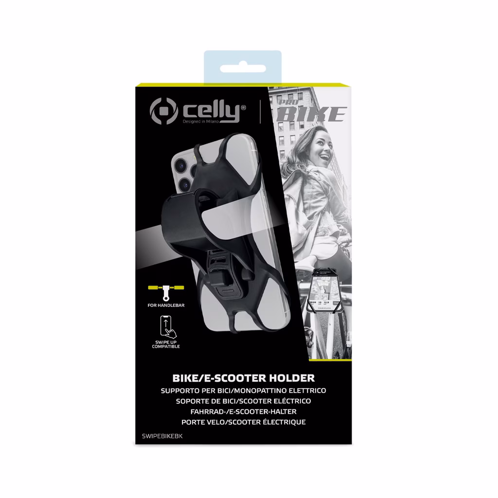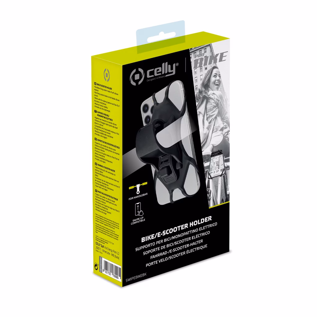 SWIPEBIKE è il supporto da manubrio per bici e monopattino elettrico in morbido silicone, compatibile con le funzionalità di swipe-up e Face-ID degli smartphone più recenti.