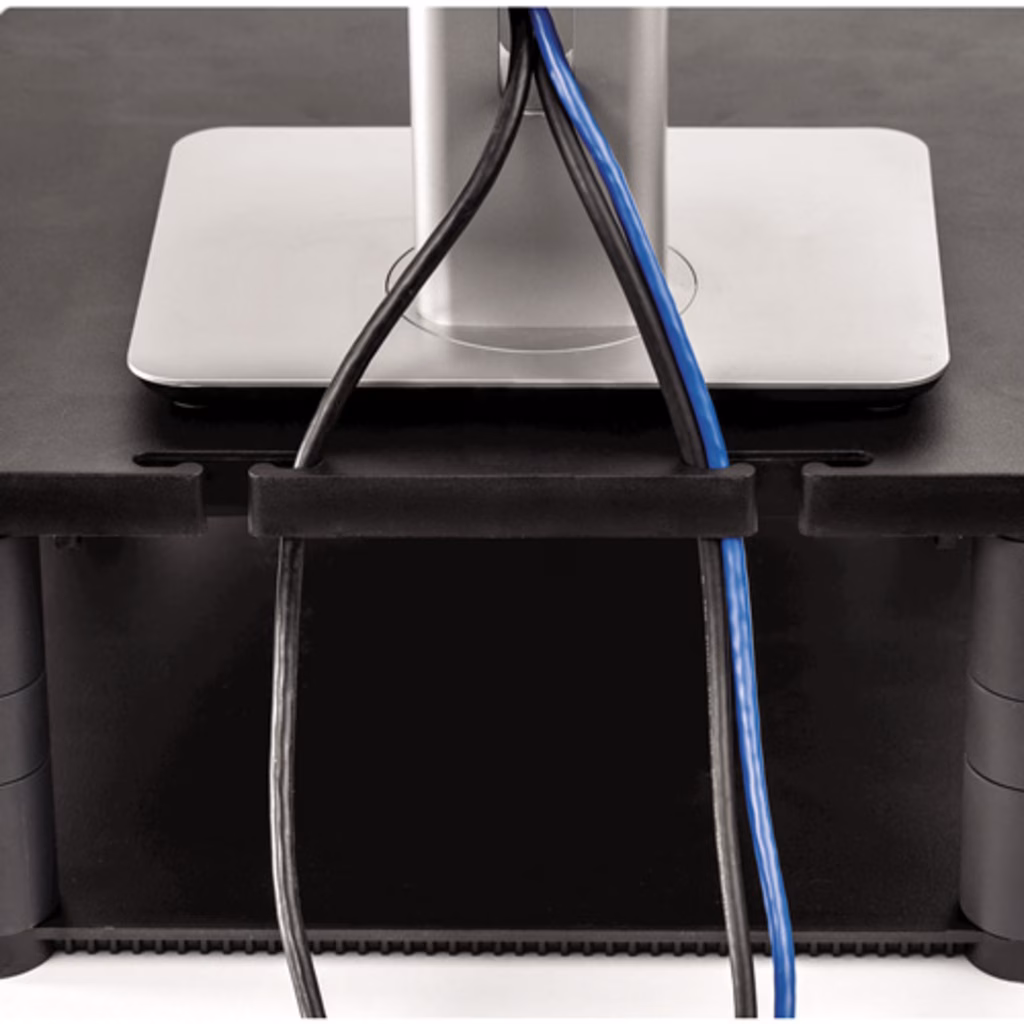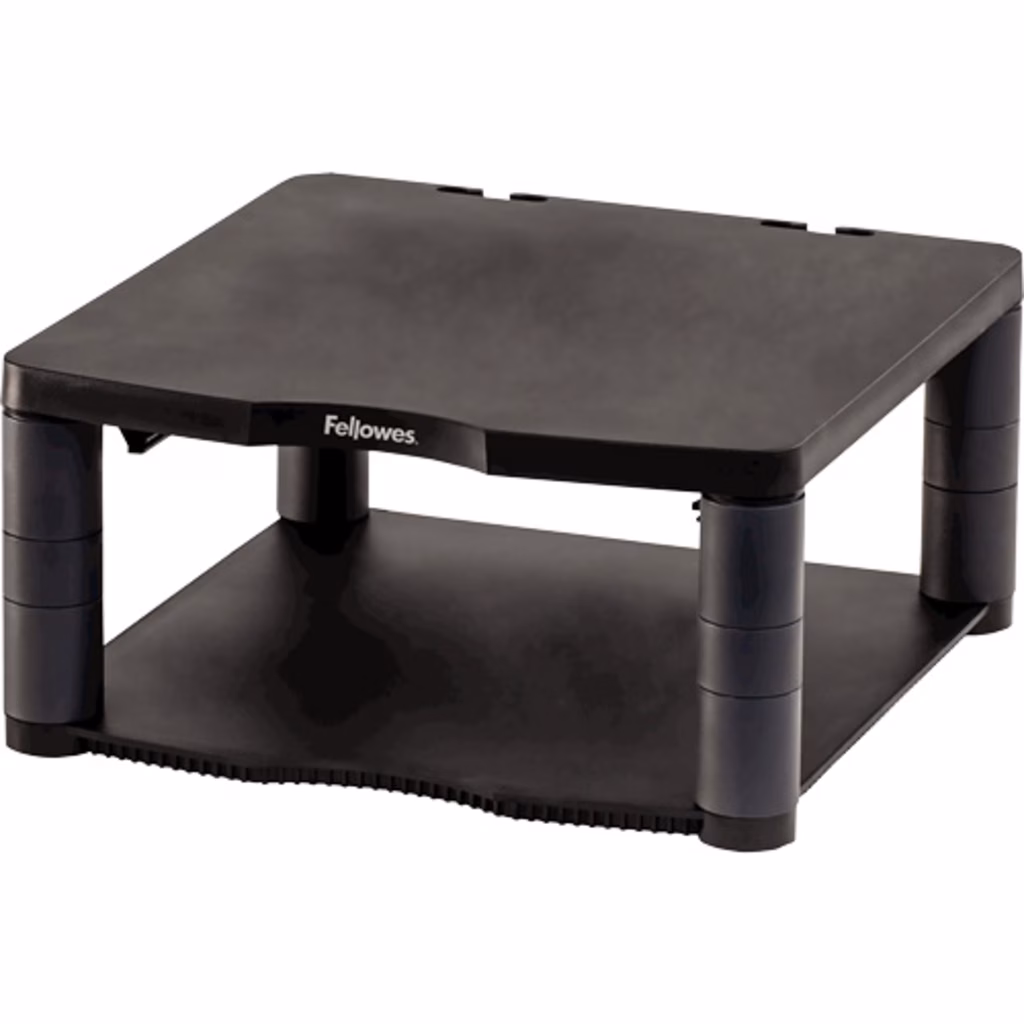 Supporto monitor costituito al 100% da plastica riciclata. Altezza regolabile in 5 livelli. Robusta base in plastica che funge da ripiano portaoggetti. Max peso Monitor 36 Kg, regolazioni d'altezza da 6,5 a 16,5 cm.