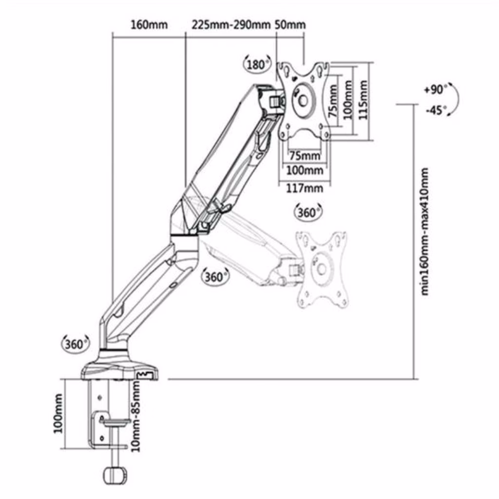 Braccio da tavolo 3 snodi con fissaggio tramite morsetto o foro passante con possibilità di regolazione dell’altezza e dell’inclinazione del moniotor in modo rapido al fine di trovare la posizione di lavoro ottimale.