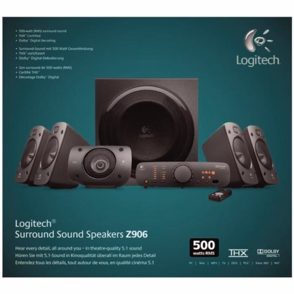 Logitech® Surround Sound Speaker System Z906: ascolta ogni minimo dettaglio intorno a te, con un suono di qualità cinematografica. 500 watt (RMS) di audio dirompente per trasformare ogni serata nella sera della "prima". La certificazione THX® ti offre tutta la qualità di cui hai bisogno, mentre la decodifica digitale integrata 5.1 ti permette di immergerti nei tuoi film preferiti e di ascoltare ogni minimo dettaglio delle colonne sonore in Dolby® Digital o DTS con suono surround, dal boato delle folla ai passi alle tue spalle. Puoi collegare contemporaneamente fino a sei componenti, inclusi TV, lettori Blu-ray /DVD, DVR, Xbox 360®, PLAYSTATION®3, Wii®, iPod® e stereo. Grazie al display di facile lettura e al design sovrapponibile, la console di comando si adatta perfettamente al del tuo sistema di intrattenimento e al tuo salotto. Grazie al telecomando wireless, inoltre, hai il controllo assoluto sulla tua esperienza di ascolto, senza doverti mai alzare dal divano.