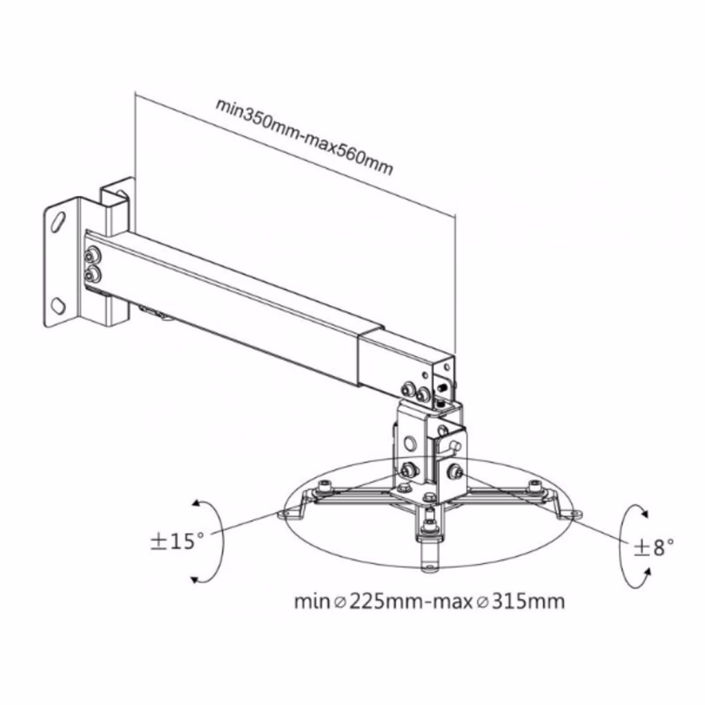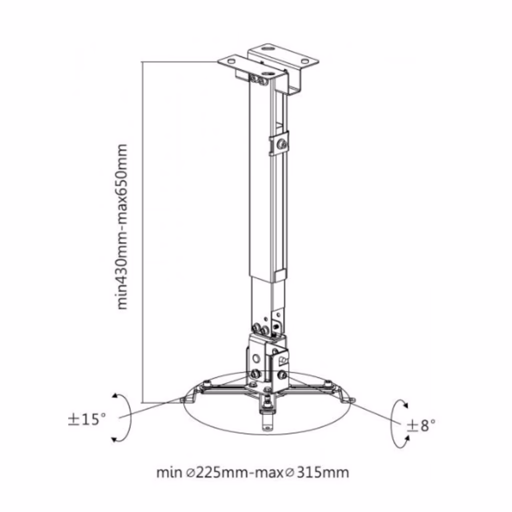 La staffa di Sopar modello Tapa 430-650 è un supporto professionale per il fissaggio dei videoproiettori a soffitto. Ha un escursione regolabile da 430 a 650 mm ( da 43 a 65 cm) ed è di tipo universale. Permette perciò di fissare diversi modelli di proiettori (con distanza di foratura da 22.5 a 31.5cm), anche grazie ai braccetti regolabili nella parte inferiore del supporto. Viene realizzata in colorazione bianca, Grigia e nera, ha una portata massima di 12 Kg ed è inclinabile +/- 20° con rotazione a 10°.