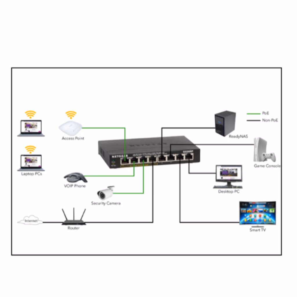 NETGEAR GS308PP Switch PoE + non gestito , con 8 porte Gigabit Ethernet, 83W PoE + Budge, Fanless - Plug-and-Play - Budget PoE aggiornabile con NETGEAR FlexPoE,Auto-bilanciamento PoE.