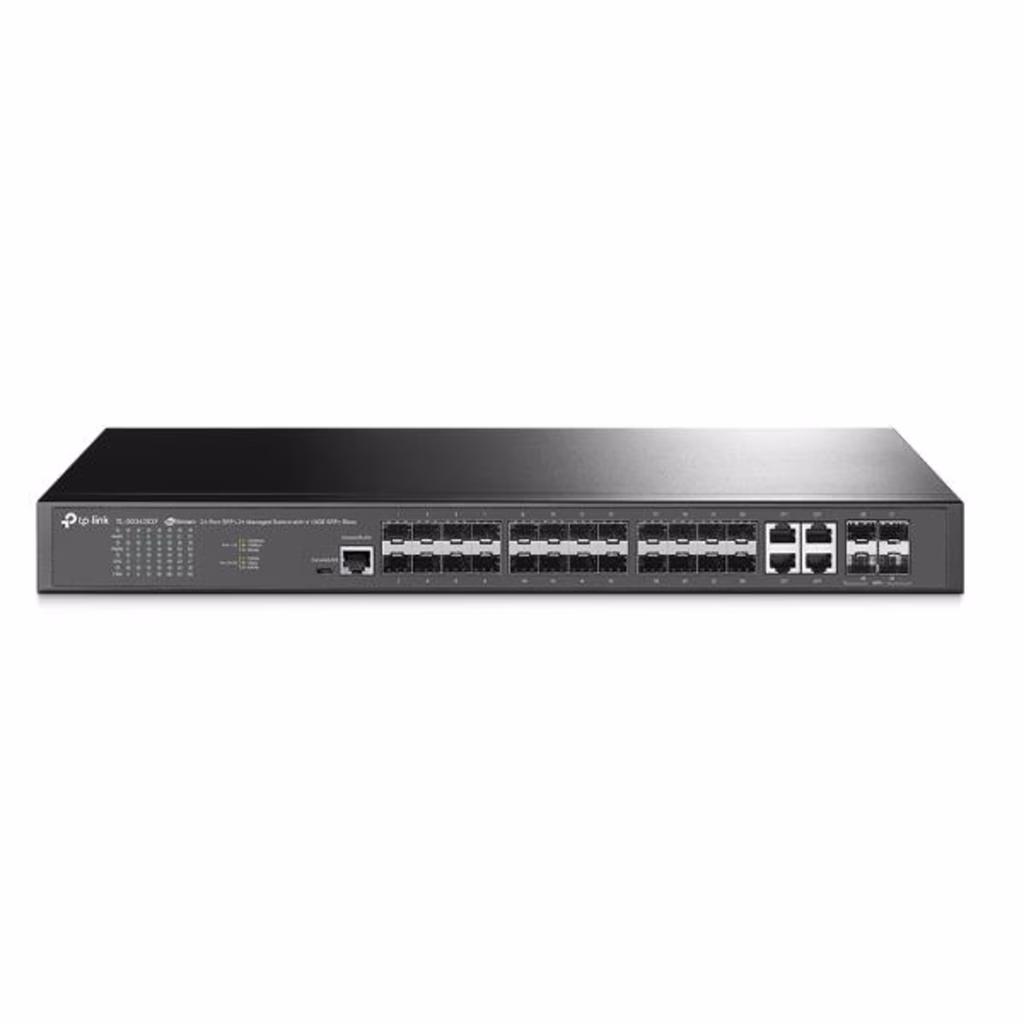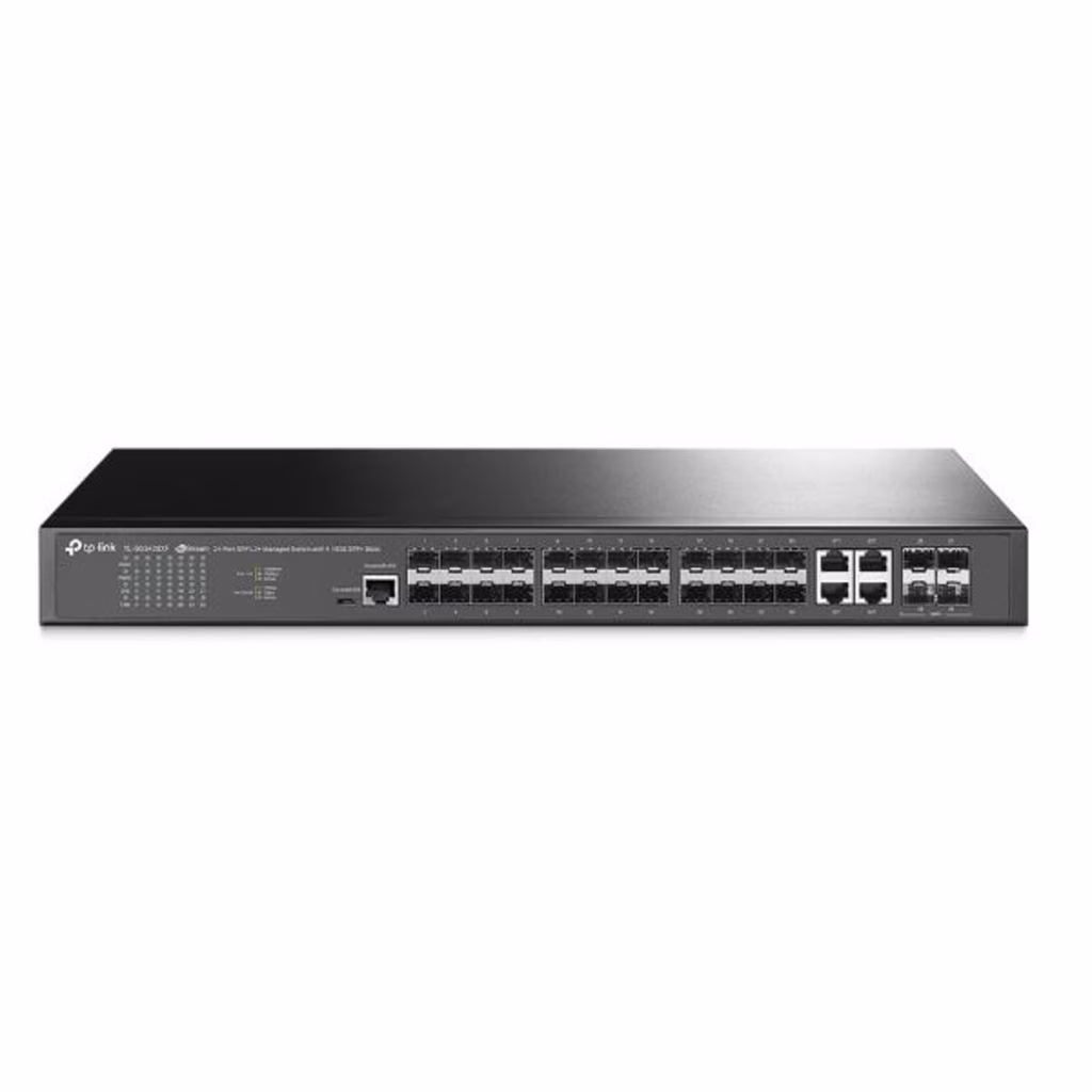 Omada 24-Port SFP L2+ Managed Switch with 4 10GE SFP+ Slots, 20× Gigabit SFP Ports, 4× Gigabit SFP/RJ45 Combo Ports, 4× 10G SFP+ Slots, RJ45/Micro-USB Console Port, 1U 19-inch Rack-mountable Steel Case, Integration with Omada SDN Controller, Static Routing, OAM, sFlow, DDM, 802.1Q VLAN, QinQ, STP/RSTP/MSTP, IGMP Snooping, 802.1p/DSCP QoS, ACL, 802.1x, Radius/Tacacs+ Authentication, LACP, CLI, SNMP, Dual Image/Configuration, IPv6, Dual Redundant Power Supplies