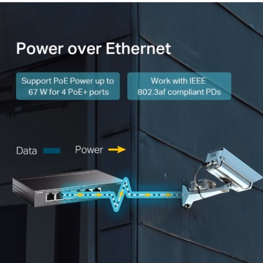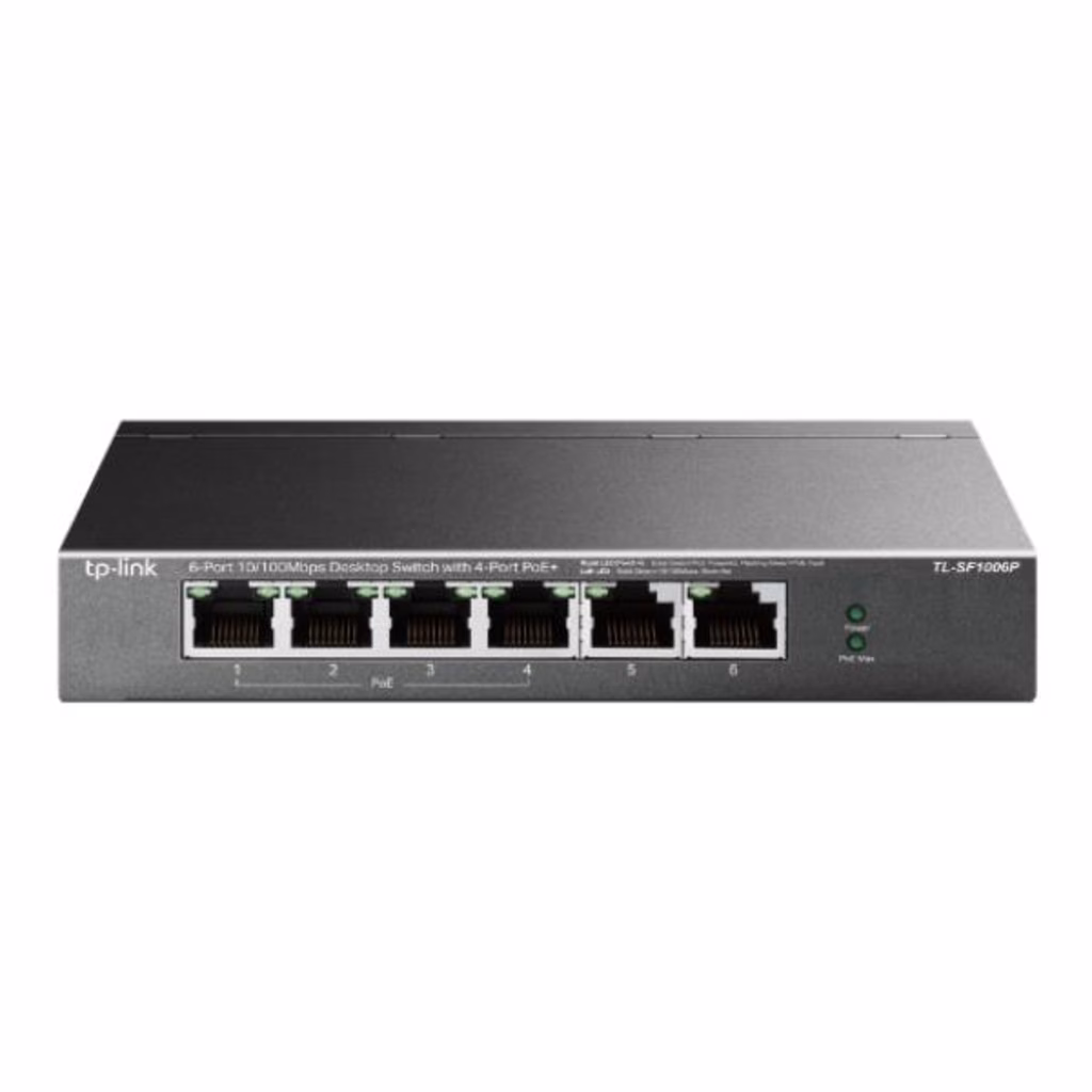 Switch Desktop - 6× Porte Fast Ethernet 10/100 Mbps, di cui 4 PoE+Supporto PoE - Standard IEEE 802.3af/at per trasmissione dati e alimentazione su un singolo cavo Ethernet, power budget totale sulle 4 porte PoE+ fino a 67 W.*