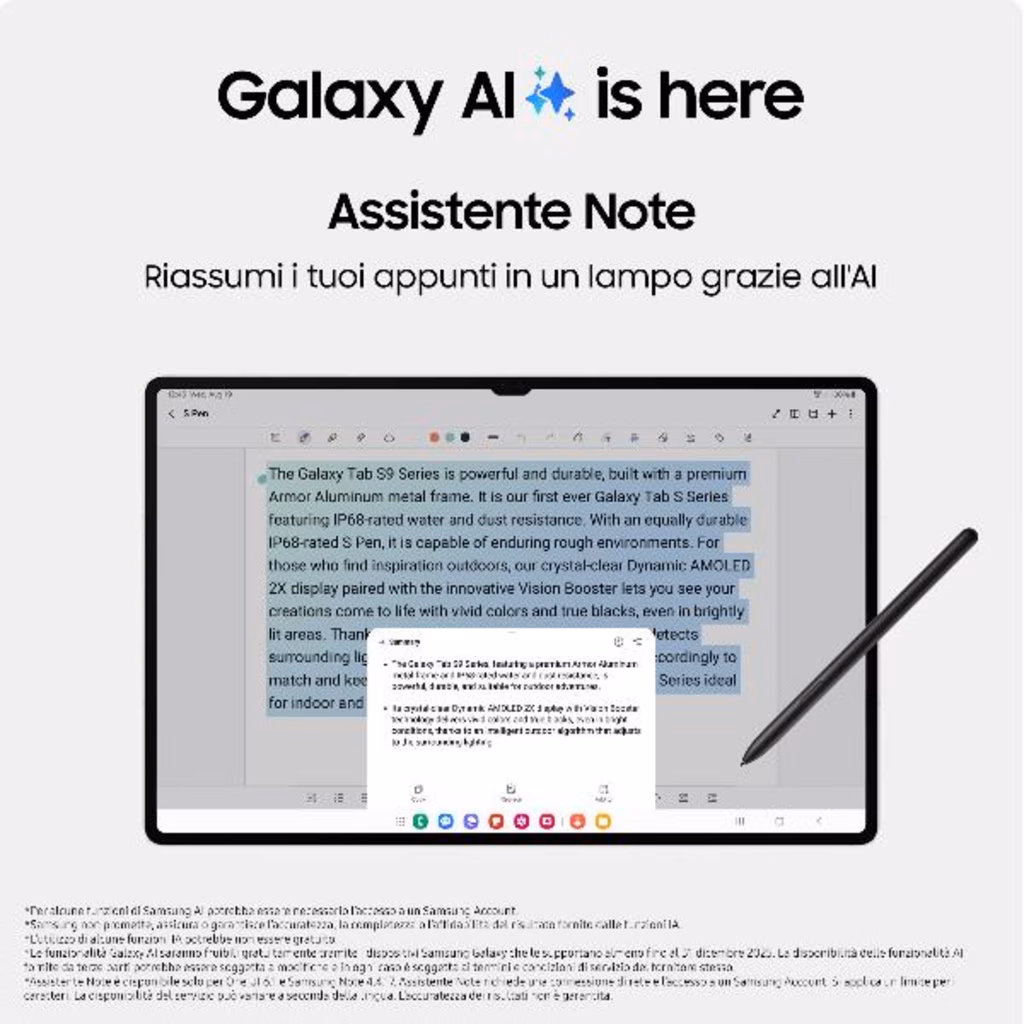 Samsung Galaxy Tab S9 presenta un displayDynamic AMOLED 2X da 11 pollici che ti offre colori e immagini brillanti. Tab S9 resiste a urti e cadute grazie alla cornice Armor Aluminum2 e alla certificazione IP68.3 Dai libero sfogo alla tua creatività con S Pen dotata di un attacco magnetico che consente di agganciarla per caricarla. Con Vision Booster4 e il velocissimo processore Snapdragon® 8 Gen 25, puoi immergerti completamente nei tuoi giochi anche in ambienti molto illuminati. Con Galaxy Tab S9, puoi dare libero sfogo alla tua immaginazione con app come GoodNotes6, Clip Studio Paint7 e LumaFusion8: tutte ottimizzate per sfruttare al meglio lampio display. Il display può raggiungere picchi di luminosità fino a 1.750 nit, migliorando il contrasto tra gli aspetti di buio e luce dei contenuti digitali per un eccellente dell immagine, con un contrasto di 3.000.000:1 che rende più coinvolgente la tua esperienza mobile.