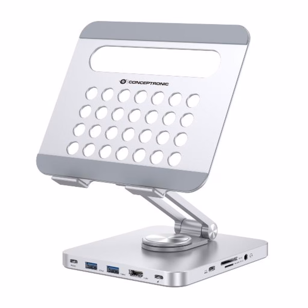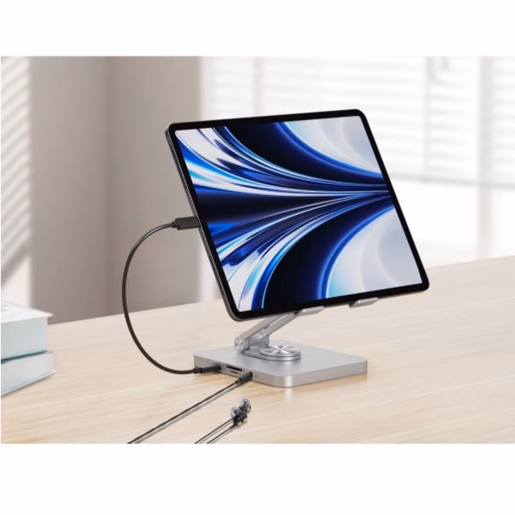Migliorate la vostra esperienza di supporto per tablet con la nostra docking station 8-in-1 integrata, che espande le funzionalità USB-C del vostro dispositivo. Il supporto offre un'altezza e un'angolazione regolabili per un posizionamento ergonomico ottimale, oltre a una base rotante a 360° per posizioni di lavoro flessibili.