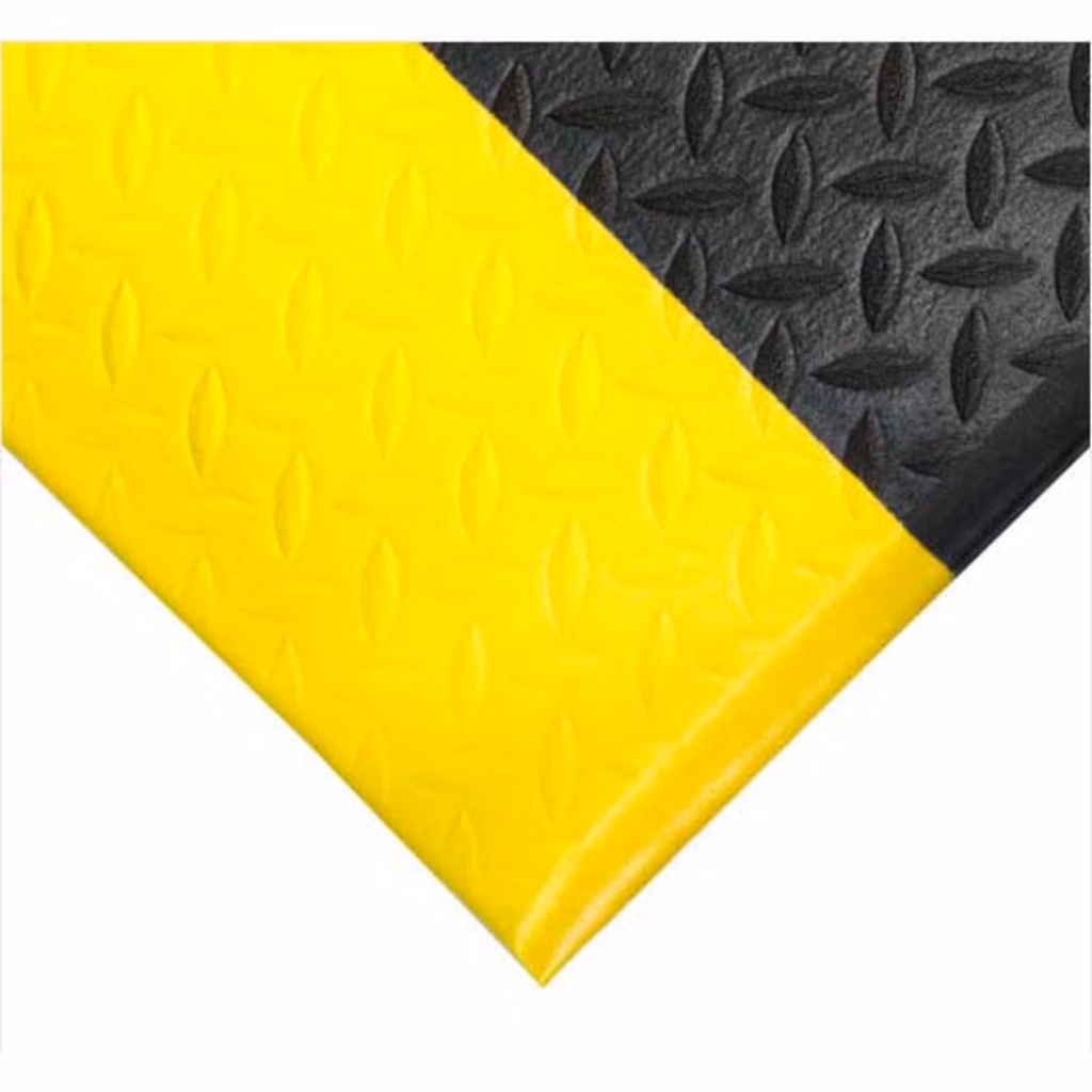 Tappetino industriale ergonomico ad uno strato di PVC a celle chiuse con superficie ad effetto lamiera di diamante antisdrucciolo - Per carichi da leggeri a medi su pavimenti di lavoro asciutti - Disponibile anche: Orthomat Safety Diamond con bordi laterali gialli di sicurezza - Spessore: 9 mm