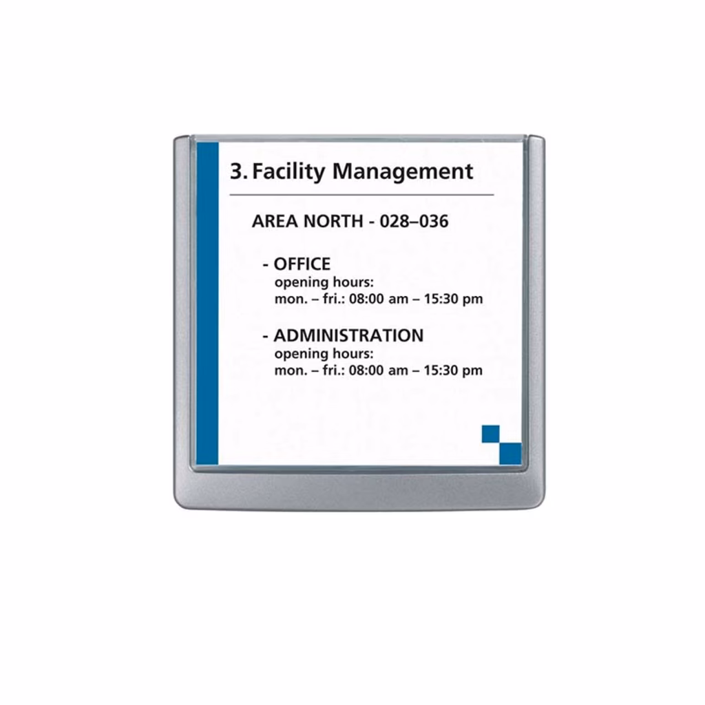 Targhe professionali per porte e pareti - realizzate in ABS color grafite e dotate di angoli smussati, si contraddistinguono per la facilità di montaggio e di utilizzo - la pratica apertura dello sportellino trasparente, infatti, permette di inserire e rimuovere velocemente linserto - fissaggio a parete attraverso viti o biadesivo compresi nella confezione - questo doppio metodo di montaggio le rende la soluzione vincente anche in ambienti dove non si desidera praticare fori - dotate di inserto in cartoncino bianco, personalizzabile collegandosi al sito www.duraprint.it