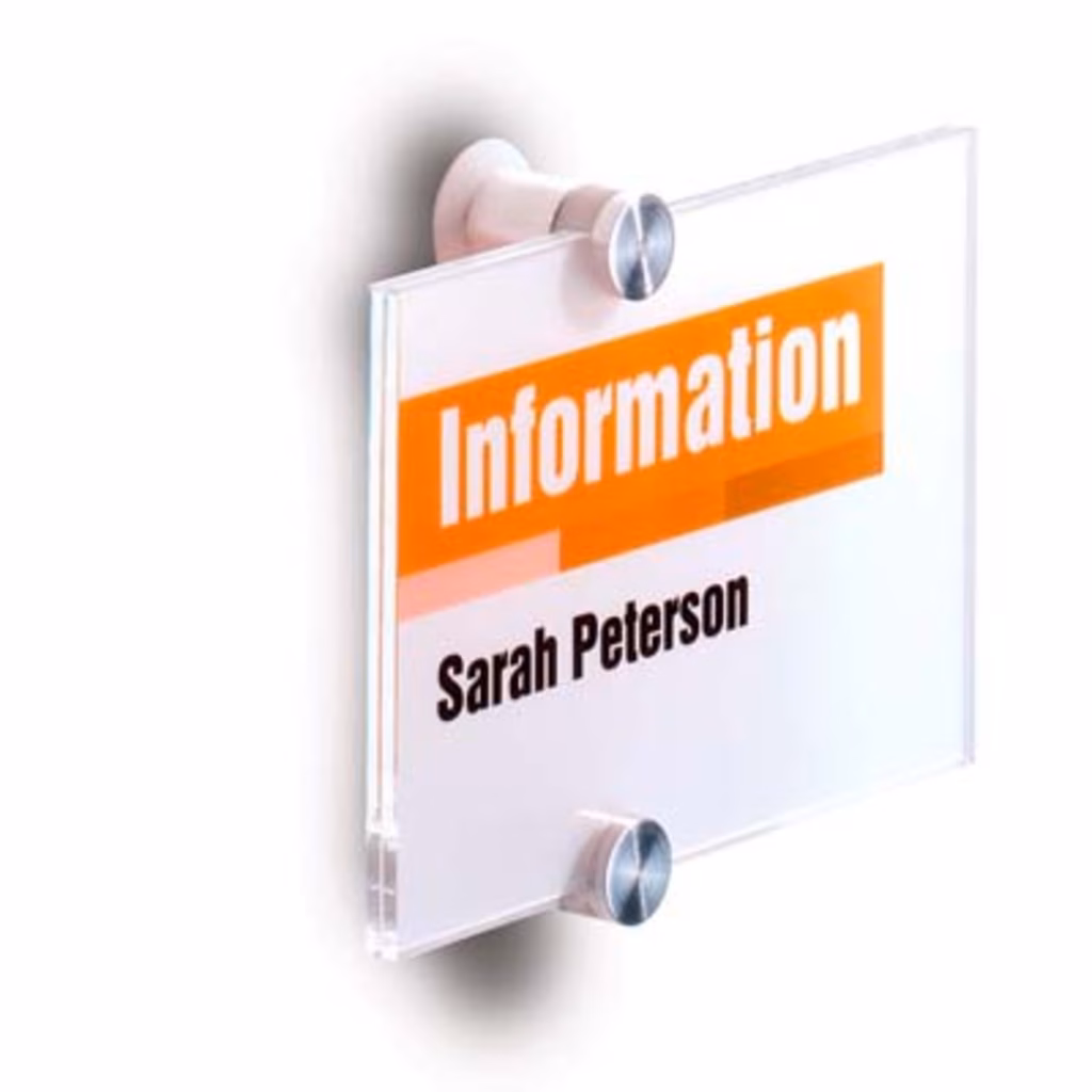 Elegante gamma di targhe per porte e pareti, ideali per ogni tipo di ambiente: le targhe sono composte da due pannelli in acrilico trasparente antiriflesso all'interno dei quali vi è un foglio traslucido che assicura un impatto estetico unico, da serigrafia, senza però i costi e i tempi dei prodotti serigrafati. Il foglio traslucido infatti può essere personalizzato in pochi minuti semplicemente collegandosi al sito www.duraprint.it e poi stampato su stampanti laser. Minuteria per il montaggio inclusa in tutte le confezioni
