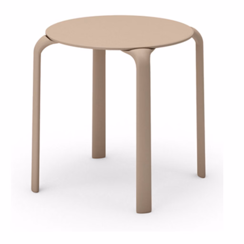 Leggero, pratico e altamente impilabile, il tavolo Drop è stato studiato per l'uso outdoor - realizzato in polipropilene caricato in fibra di vetro con coiniezione di un secondo materiale interno - Tavolo fisso proposto con piano rotondo Ø 70 cm - Base 4 gambe con piedini in gomma - Impilabile in modo verticale