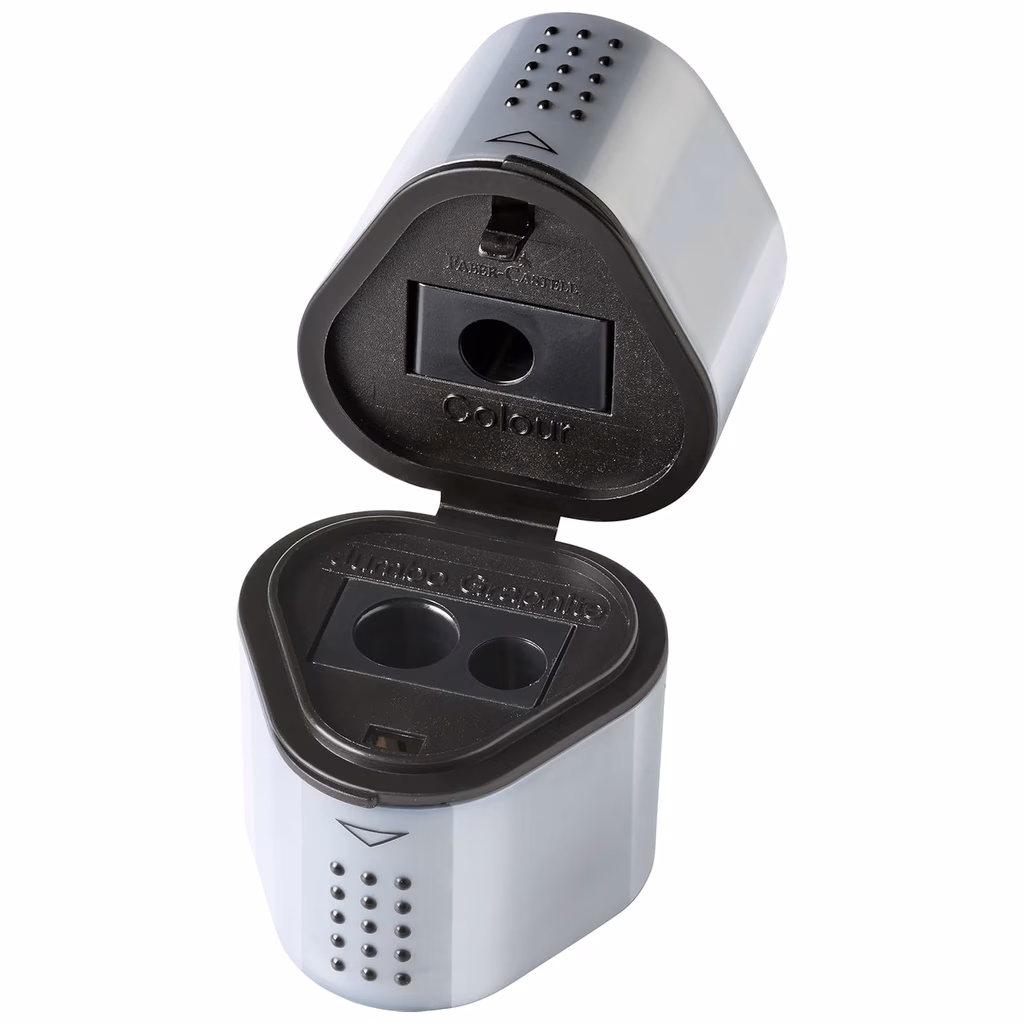 Temperamatite di qualità 3 in 1. Ideale per matite di grafite e colorate. Per tutte le forme di matite in commercio: Standard e Jumbo. Il classico design Grip ha preso piede con successo anche nel mondo degli affilatori. La popolare forma triangolare con i punti Grip dots è ben nota e promette un'eccellente ergonomia.