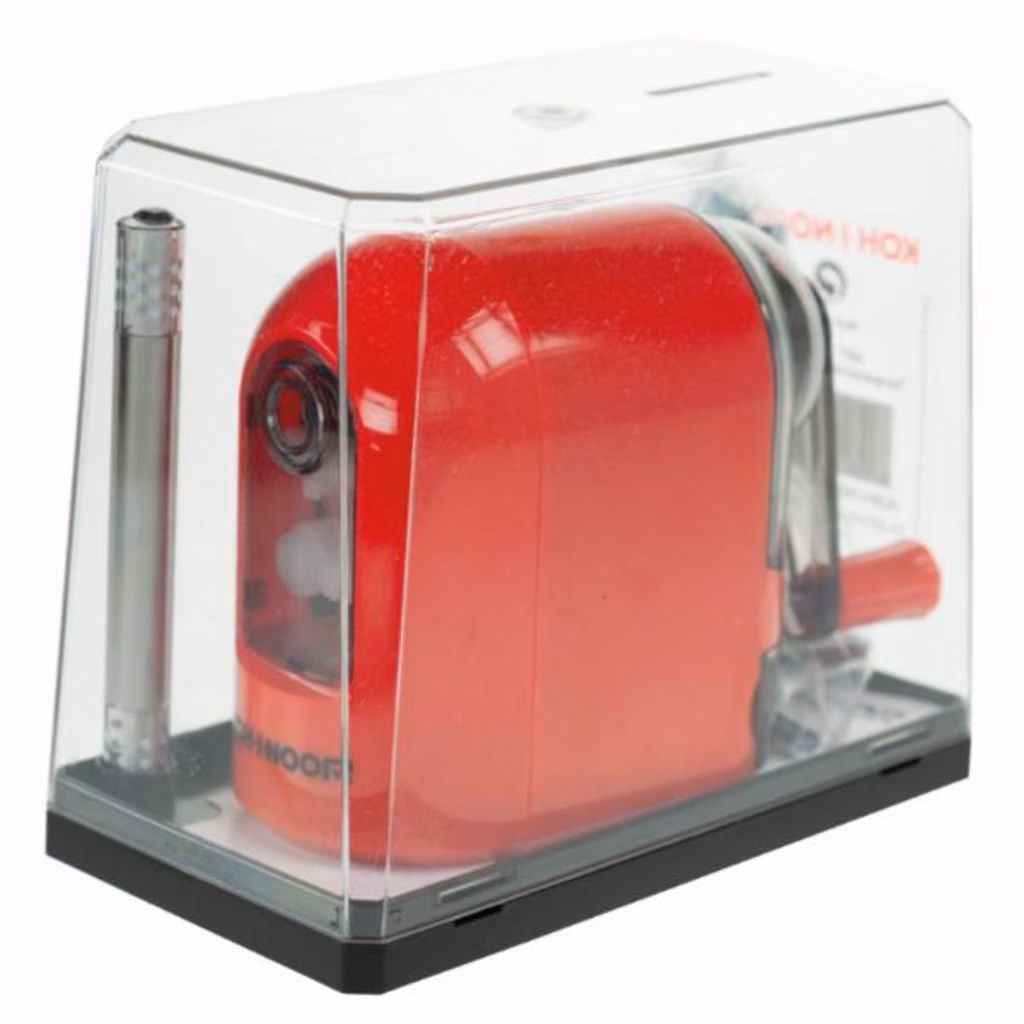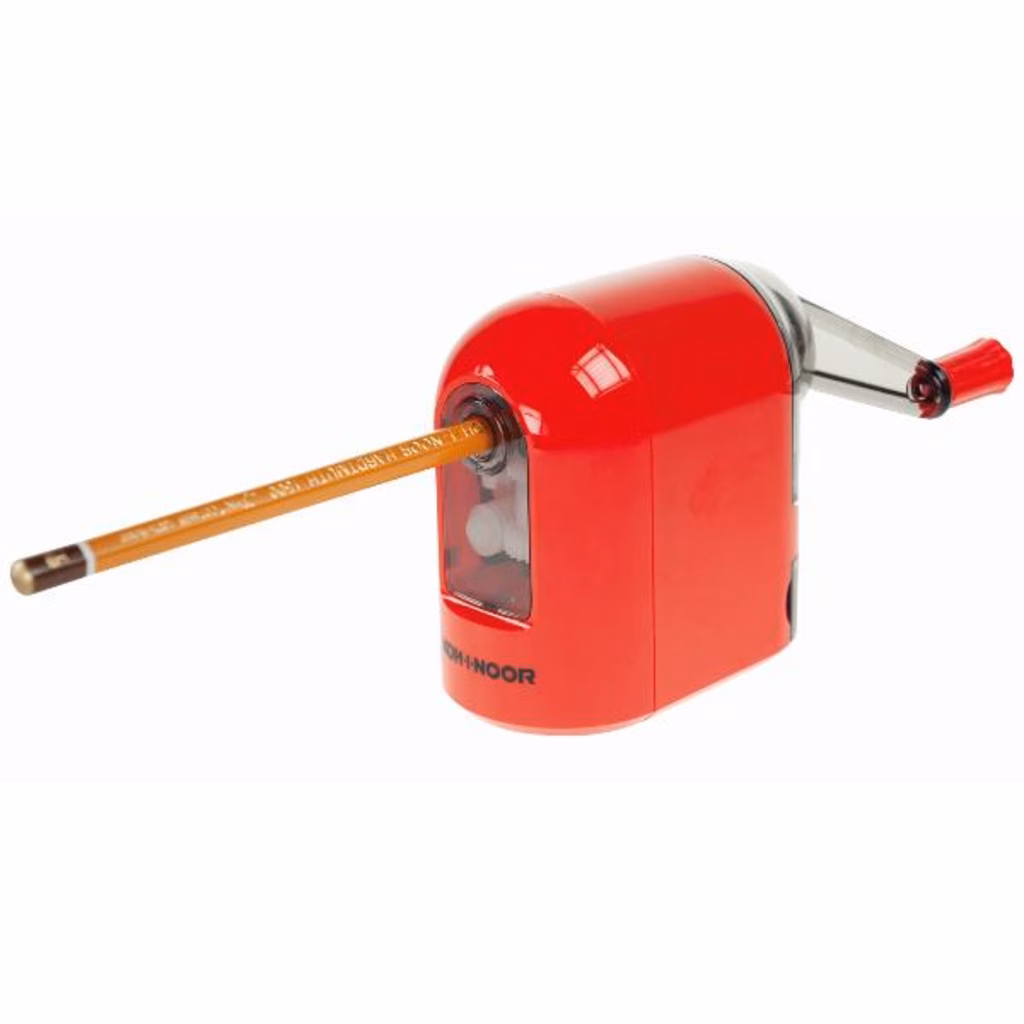 Temperamatite da tavolo a manovella con fresa in acciaio, serbatoio e morsetto per fissarlo al tavolo.