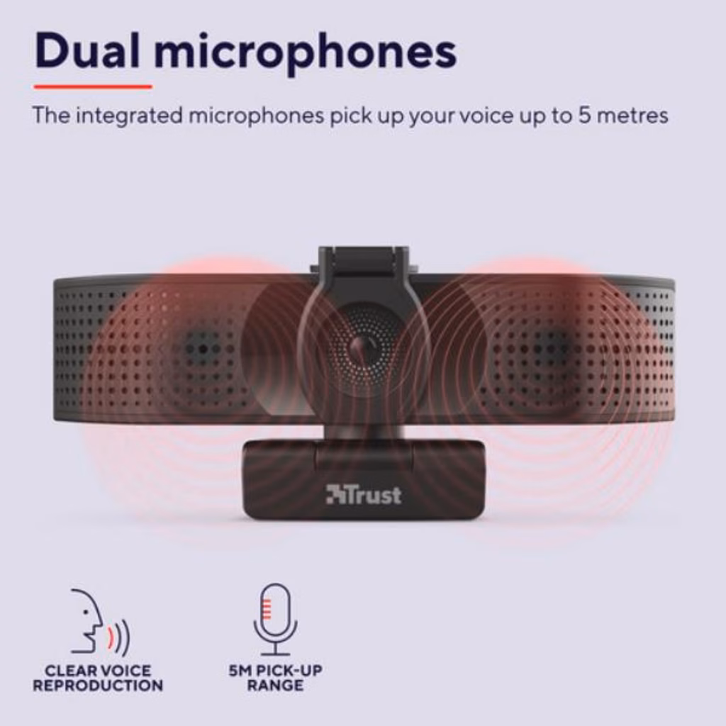 Sii convincenteUn doppio microfono stereo incorporato cattura audio in alta qualità e acquisisce suoni chiari da più direzioni. Una webcam, una sala riunioni, zero problemi.