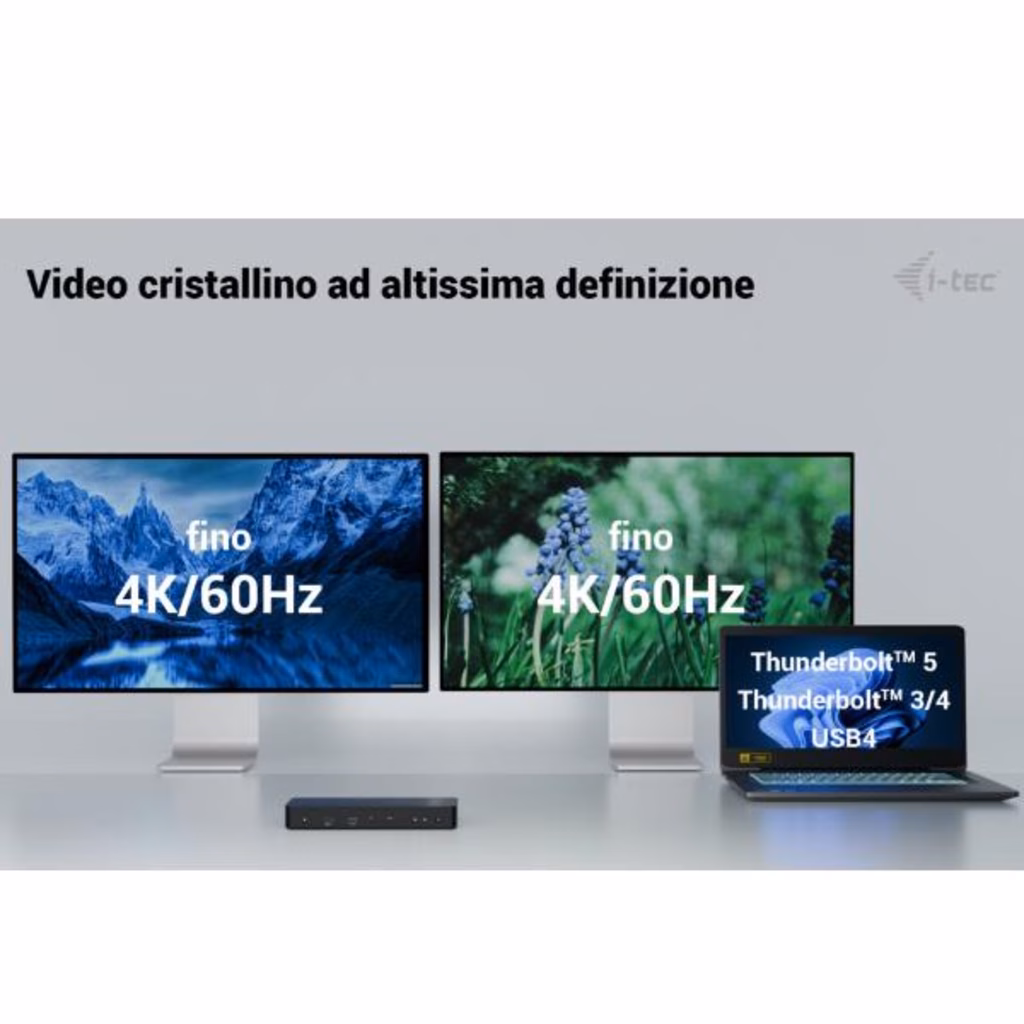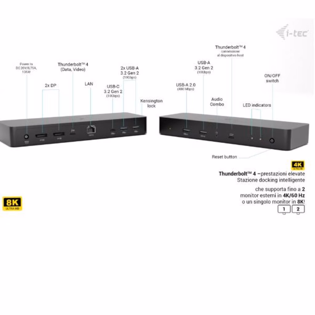 Scoprite una tecnologia di docking rivoluzionaria.DOCKING STATION UNIVERSALE CON ALTE PRESTAZIONI.Progettata se si ha necessità anche per la gestione remota completa. Grazie alla porta LAN dedicata, gli amministratori IT possono controllare il dock da qualsiasi luogo*. Il software di gestione remota è disponibile come componente aggiuntivo opzionale e può essere acquistato in qualsiasi momento. Naturalmente, la docking station funziona con tutte le funzionalità anche senza di esso; l unica limitazione è l assenza delle funzioni di gestione remota. E soprattutto, la gestibilità funziona senza una connessione host: sono necessari solo l alimentazione e la LAN. NOTA: il software è disponibile solo per computer Windows.Una docking station Thunderbolt 4 di nuova generazione ad alte prestazioni che offre un uscita fino a due monitor 4K esterni o un singolo display 8K. Compatibile con praticamente tutti i notebook dotati di porte USB-C**, USB4 o Thunderbolt e supporta tutti i principali sistemi operativi.Con più porte USB (tra cui USB 3.2 Gen 2 con velocità fino a 10 Gbps), una porta Thunderbolt 4 che offre video 8K o trasferimento dati ultraveloce a 40 Gbps e una connessione LAN affidabile e ad alta velocità, questa docking station è la soluzione ideale per i professionisti più esigenti. Naturalmente, supporta anche un alimentazione fino a 90 W per mantenere carico il notebook o il tablet.Collega un singolo display 8K o fino a due monitor esterni con risoluzioni fino a 4K**Erogazione di potenza fino a 90 W2 porte DisplayPort e 1 porta Thunderbolt 4 disponibili5 porte USB: 1 USB-A (10 Gbps, ricarica rapida BC 1.2), 2 USB-A (10 Gbps), 1 USB-A (2.0) e 1 USB-C (Gen 2, 10 Gbps)Gigabit Ethernet intelligente (RJ-45) offre una connettività affidabile e ad alta velocità con supporto 10/100/1000 Mbps e funzionalità di gestione remota senza interruzioniJack audio/microfono combinatoLo slot per lucchetto Kensington offre protezione antifurto, ideale per uffici condivisi o aree pubblicheL interruttore di alimentazione sulla docking station consente il massimo risparmio energeticoSupporta Windows 10/11, macOS, iPadOS, Android, ChromeOS e Linux (versioni più recenti)* A causa del funzionamento della tecnologia Thunderbolt , i-tec DockMate può gestire la docking station stessa (ad esempio accensione/spegnimento remoto, risparmio energetico programmato o aggiornamenti del firmware), ma non può controllare direttamente le singole porte come USB, LAN, audio o uscite video.** È supportato un solo monitor esterno quando collegato tramite una porta USB-C.