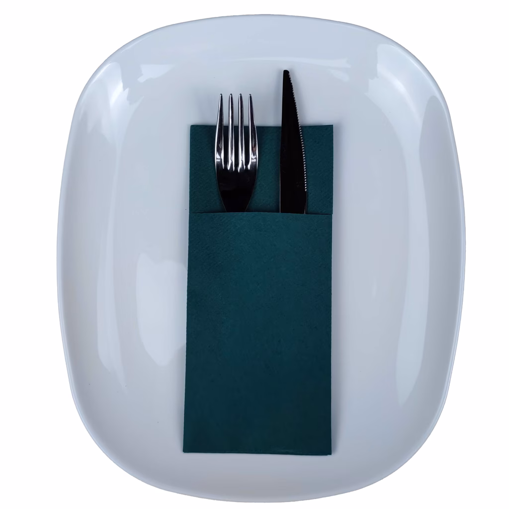 Tovagliolo piegato porta posate Pocket in Airlaid, tessuto in cellulosa morbido e consistente le cui fibre vengono lavorate "a secco" con un'avanzata tecnica ad aria, ottenendo un risultato molto simile alla stoffa - realizzati in materiale ecologico e completamente compostabile per garantire il massimo rispetto per l'ambiente - non provengono dalla manipolazione di sostanze chimiche o sostanze sintetizzate in laboratorio, bensì da risorse rinnovabili e non sono tossici - si smaltiscono nell'umido