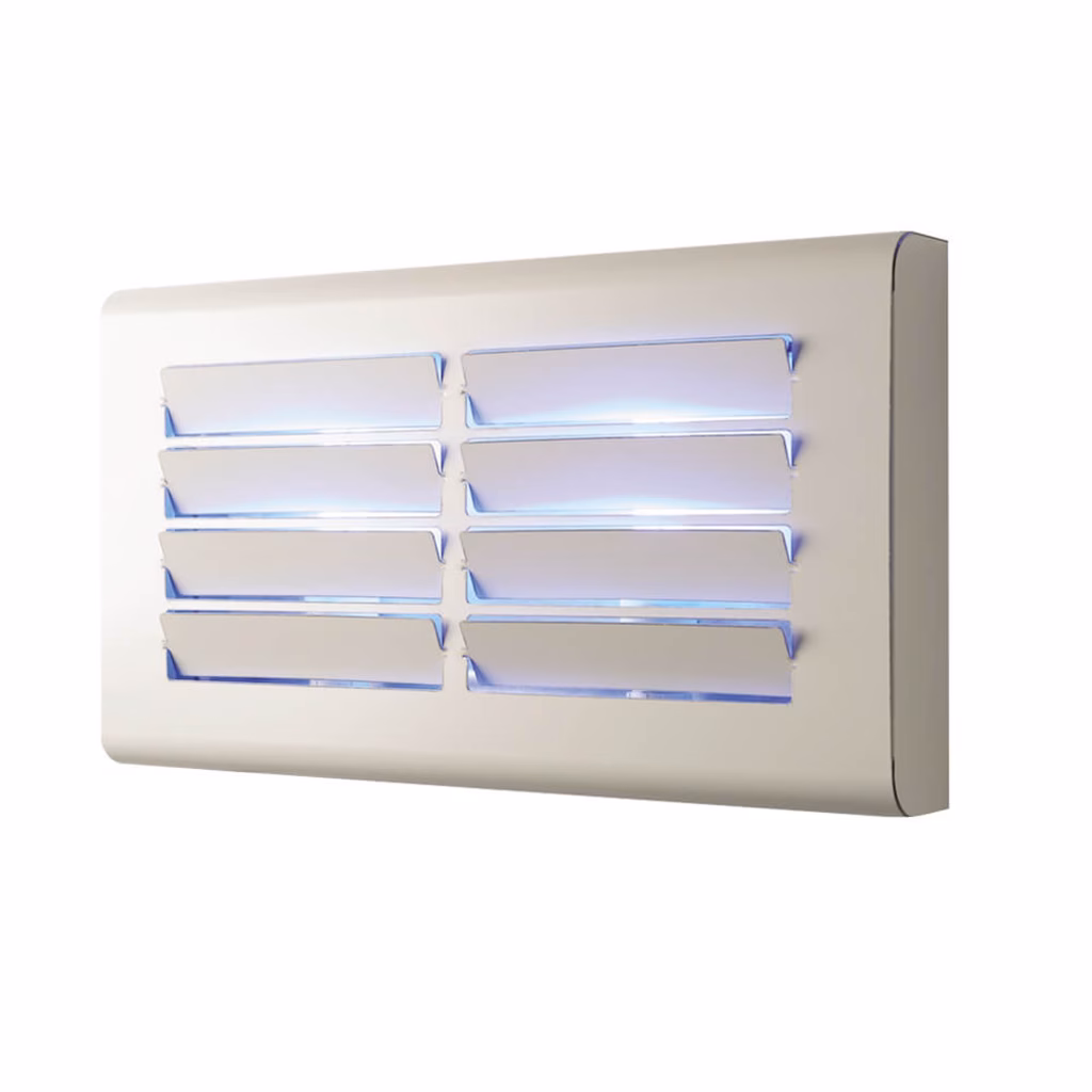 Trappola elettroluminosa da parete per insetti volanti idonea per una protezione di c.a. 80mq - costriuta in metallo verniciato, cattura gli insetti grazie ad un cartone collante posto dietro le due lampade UV - può essere impiegato in luoghi pubblici, alberghi, bar ristoranti, palestre, caserme, industrie in genere, industrie alimentari