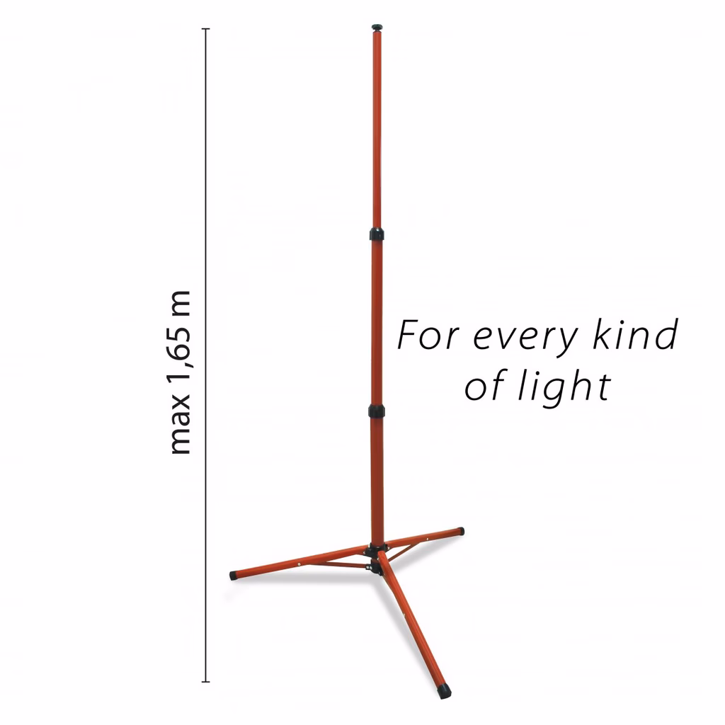 Treppiede per montaggio di 1 faretto LED o alogeno fino a 500W; compatibile anche con fari Velamp DOOMSTER e X-Blast, nonché tutti i faretti Velamp - treppiede particolarmente robusto e stabile - robusto tubo in alluminio con rivestimento rosso - tre stabili tubi verticali extra lunghi, per assicurare una stabilità massima - altezza regolabile, massima: 165 cm - dettagli del prodotto