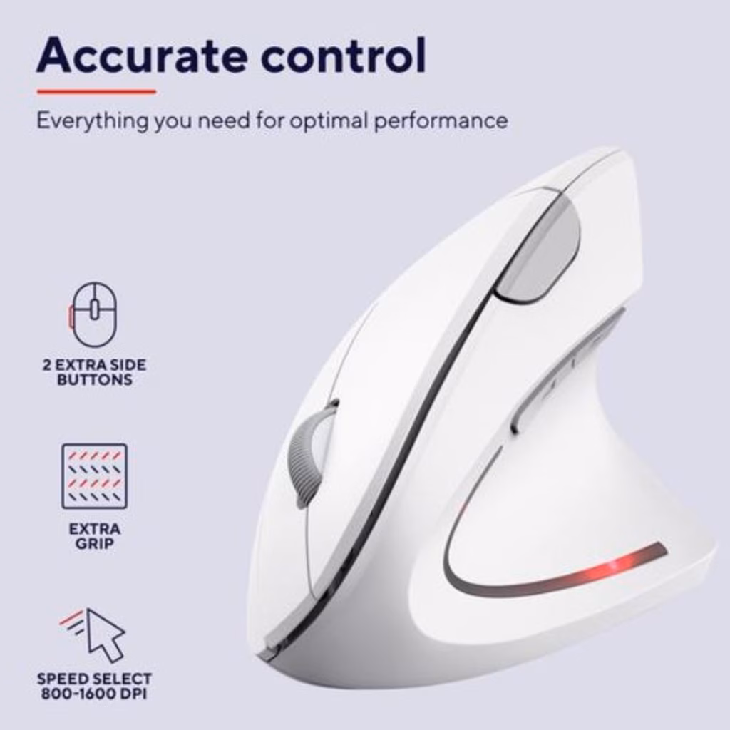 La forma ergonomica del mouse ergonomico wireless Verto permette al braccio e al polso di assumere una posizione naturale a 60°, riducendo la tensione a loro carico e consentendoti più comfort e produttività sul lavoro.