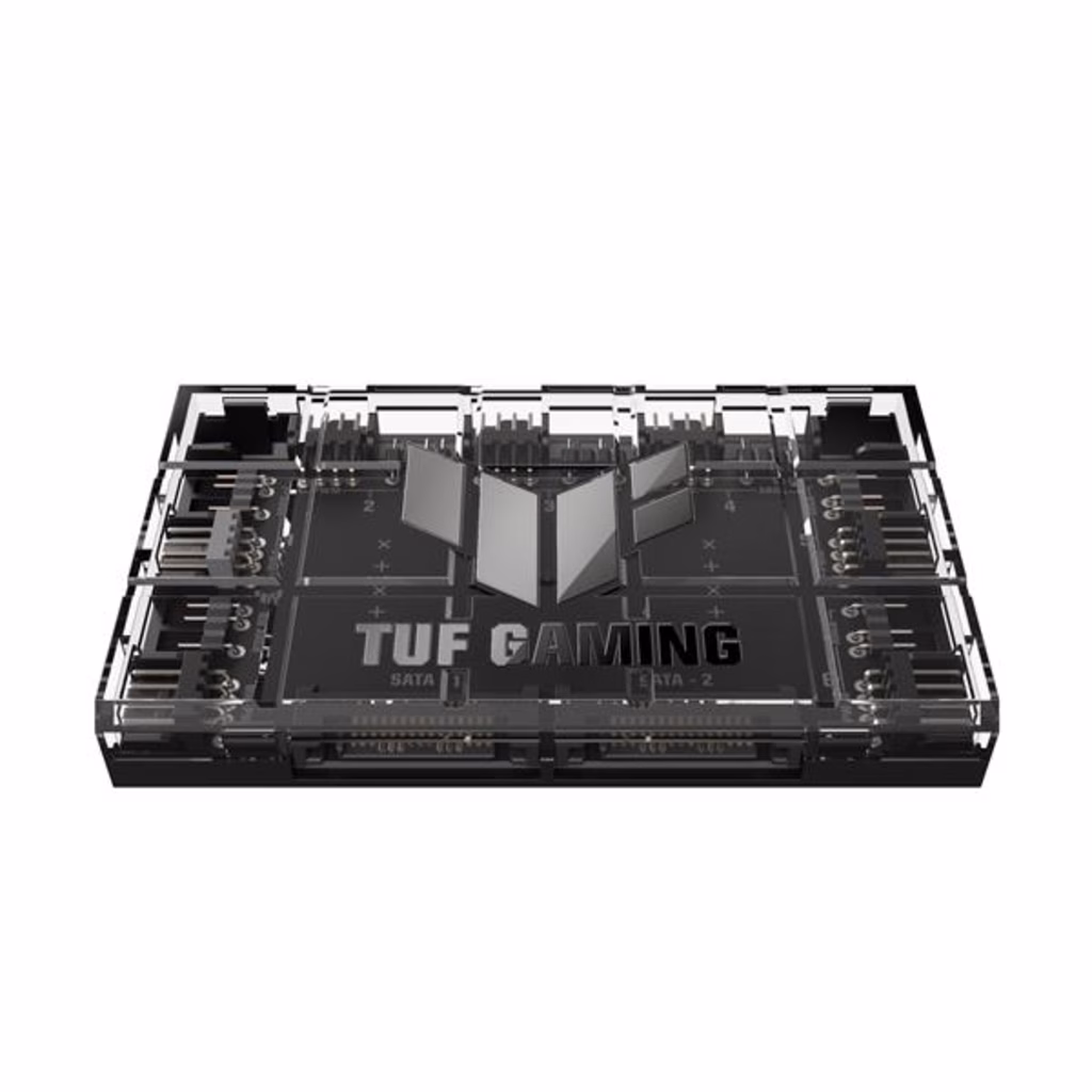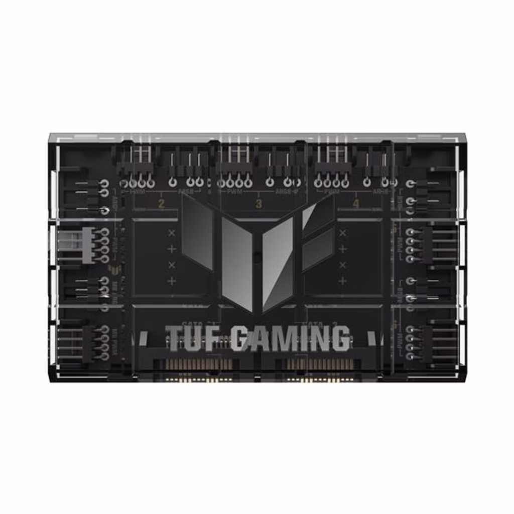 TUF Gaming ARGB PWM Fan Hub collega fino a sei ventole del case per il controllo PWM e ARGB, sincronizzando gli effetti di raffreddamento e illuminazione senza soluzione di continuità.