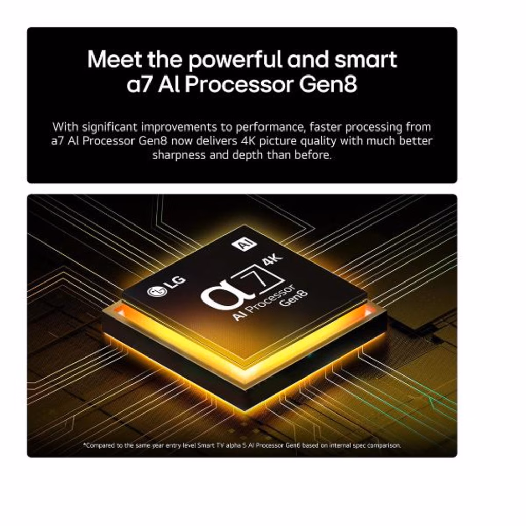 Il nuovo processore a7 Gen8 offre prestazioni superiori rispetto al modello precedente, grazie a una maggiore memoria e a una velocità di elaborazione più elevata. Utilizzando l'Intelligenza Artificiale, ottimizza i contenuti visualizzati sul TV con un'elaborazione accurata delle immagini e del suono. Trasforma i contenuti a risoluzione inferiore in 4K e rende l'audio più avvolgente con 9.1.2 canali virtuali.