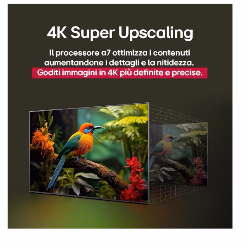 Il nuovo processore a7 Gen8 offre prestazioni superiori rispetto al modello precedente, grazie a una maggiore memoria e a una velocità di elaborazione più elevata. Utilizzando l'Intelligenza Artificiale, ottimizza i contenuti visualizzati sul TV con un'elaborazione accurata delle immagini e del suono. Trasforma i contenuti a risoluzione inferiore in 4K e rende l'audio più avvolgente con 9.1.2 canali virtuali.