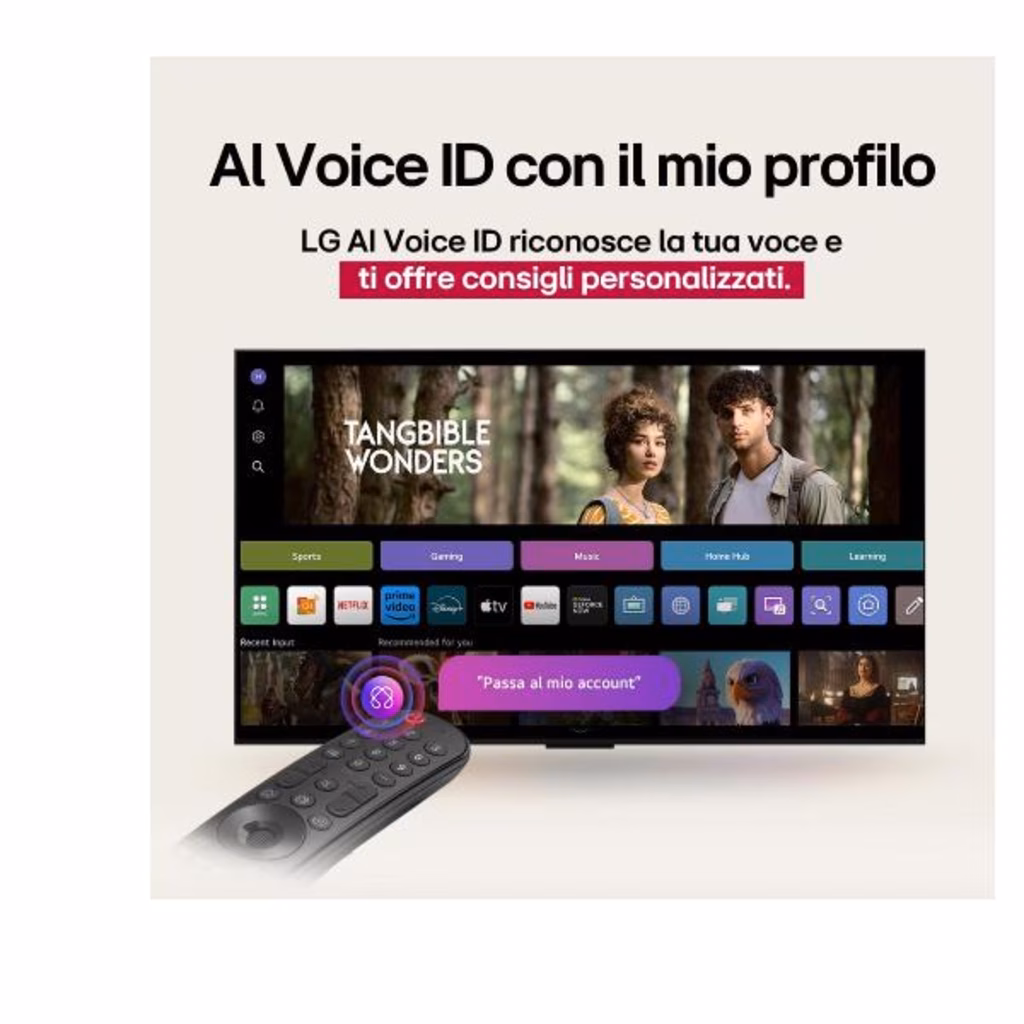 Quando accendi il TV, riconosce automaticamente la tua voce e imposta il tuo profilo per darti un'esperienza personalizzata. Ad esempio, ti consiglia nuovi contenuti da guardare in base alla tua cronologia di visione, imposta la schermata principale con le app che usi di più e ti suggerisce le parole chiave da usare per scoprire nuove funzioni.
